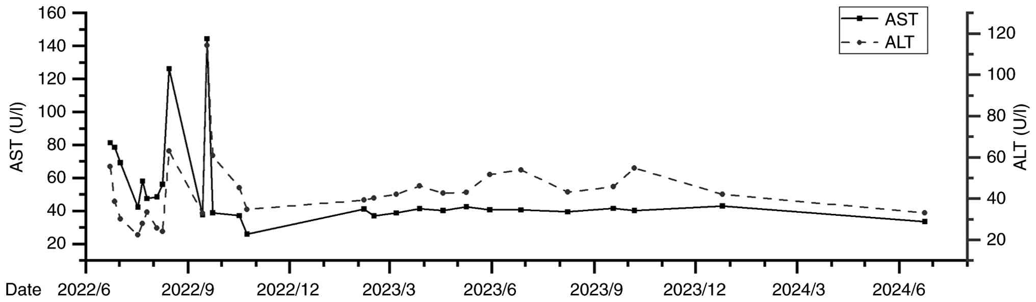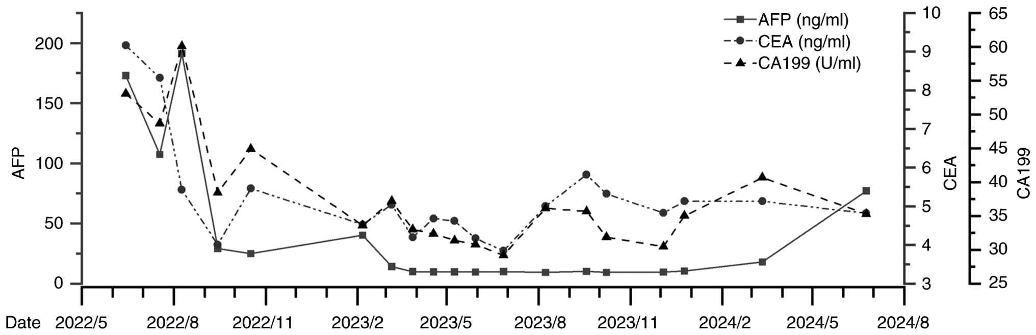 To date, the patient has undergone seven sessions of TACE and eight sessions of combined targeted immunotherapy, and the patient's condition is stable (Table I). Following the initiation of combined therapy, the tumor size gradually decreased and stabilized on serial imaging assessments performed between June 2022 and August 2024 (Fig. 7); liver function has remained stable (Fig. 8), and tumor marker levels have gradually decreased and stabilized (Fig. 9). As of August 2024, no significant adverse reactions have been observed. Quality of life has significantly improved and the patient is still undergoing regular follow-up.