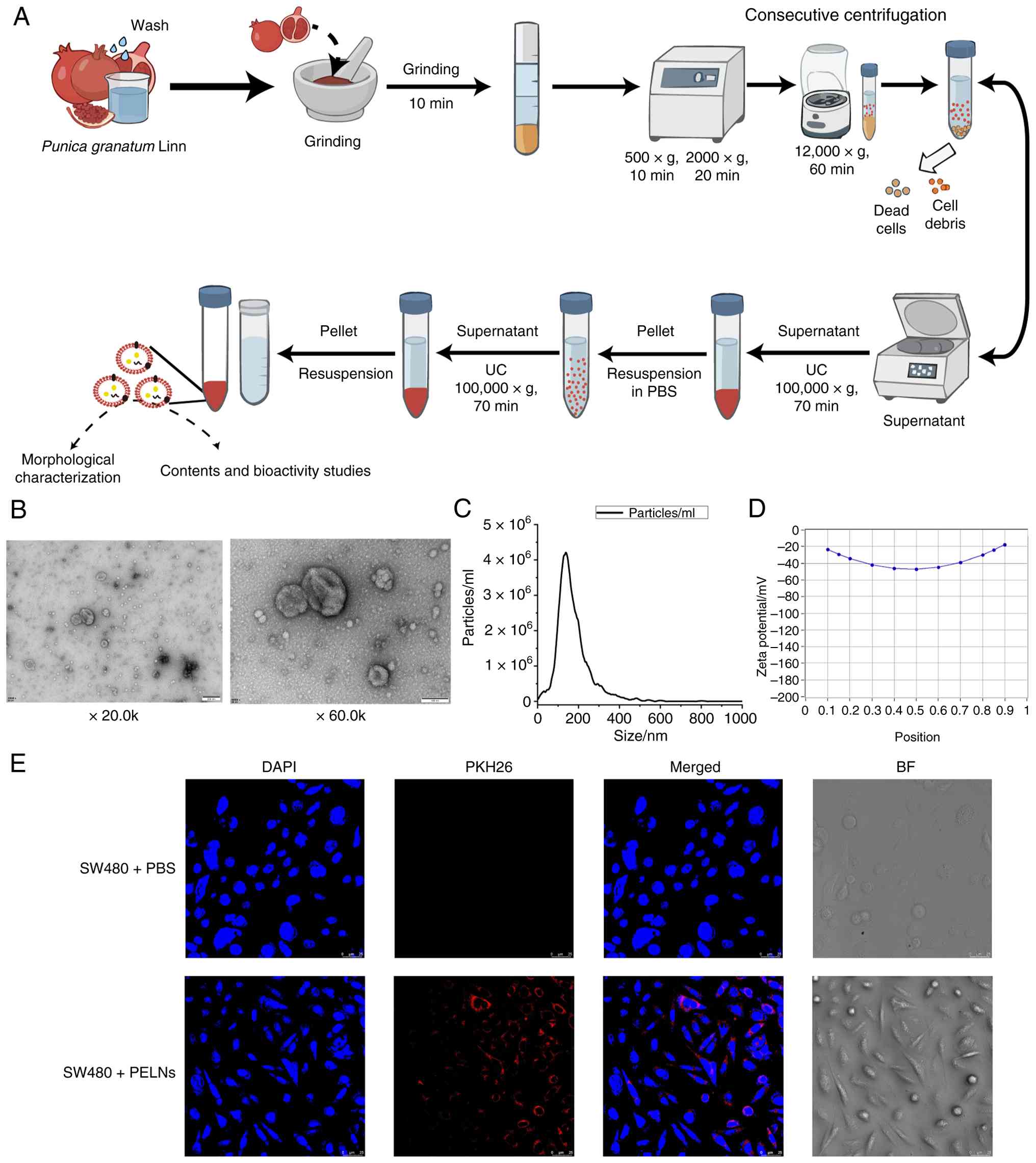 ELNs were isolated from the juice found in the pomegranate peel. A total of ~50 g of pomegranate peel was washed with ultra-pure water, ground with phosphate-buffered saline (PBS) buffer, and filtered through a strainer to collect the leaching filtrate solution. The filtrate was then centrifuged at 500 × g for 10 min, 2,000 × g for 20 min, and 12,000 × g for 60 min to remove dead cells and cell debris (Fig. 1A). The supernatant was subsequently ultra-centrifuged at 100,000 × g for 70 min at 4°C (Thermo Fisher Scientific, Inc.). The pellet was resuspended in PBS and then ultra-centrifuged again for 70 min. Finally, the PELNs were resuspended in PBS and stored at −80°C until further analysis.