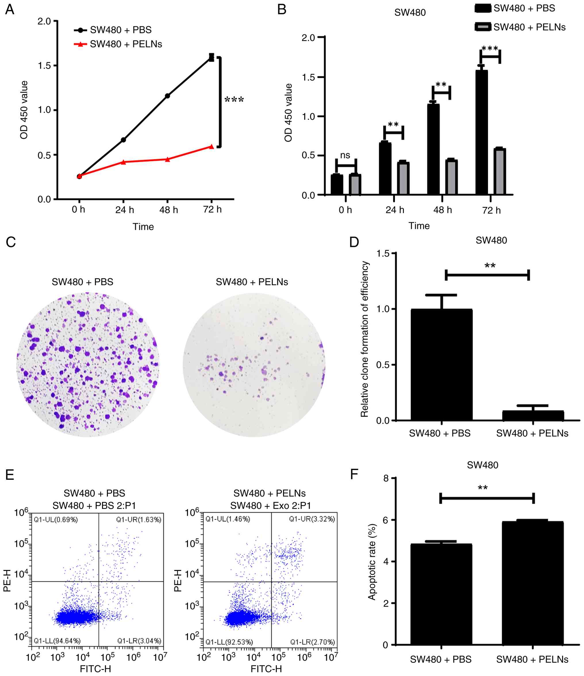 The effect of PELNs on SW480 cell proliferation was assessed using a Cell Counting Kit-8 (CCK-8; Beijing Solarbio Science & Technology Co., Ltd.). SW480 cells were seeded in 96-well plates and treated with PBS (Control group) or PELNs (PELN group) for 0, 24, 48 and 72 h. Next, 10 µl of CCK-8 reagent was added to each well and further cultured for 1 h at 37°C. The absorbance was measured at 450 nm using an enzymatic reader (Bio-Rad Laboratories, Inc.).