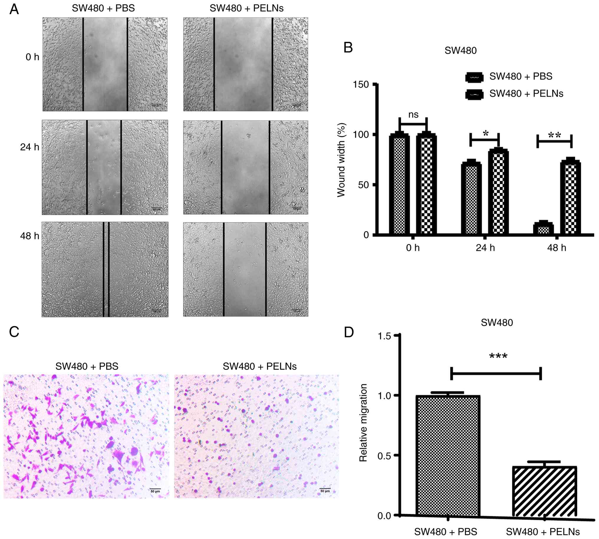 Wound healing and Transwell migration assays were carried out to evaluate the effect of PELNs on the migration ability of CRC cells. SW480 cells were treated with PELNs after generating scratch wounds in the plate wells. The changes in wound width were observed at 0, 24 and 48 h. The wound width in the PELN-treated group was significantly increased compared with that in the control group (P<0.001; Fig. 3A and B).