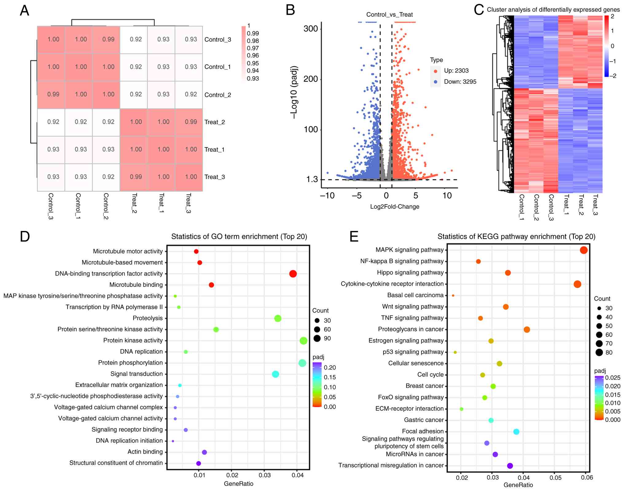 The sample correlation analysis heat map indicated that the correlation between repeated samples was strong, confirming experimental reproducibility (Fig. 4A). DEGs of SW480 cells after treatment with PBS (Control-1, Control-2 and Control-3) or PELNs (PELNs-1, PELNs-2 and PELNs-3) were statistically analyzed. The results of a volcano plot and cluster analysis showed that there were 2,303 upregulated and 3,295 downregulated genes (Fig. 4B and C). KEGG pathways and GO terms related to DEGs were subsequently analyzed based on the functional annotation results in the database.