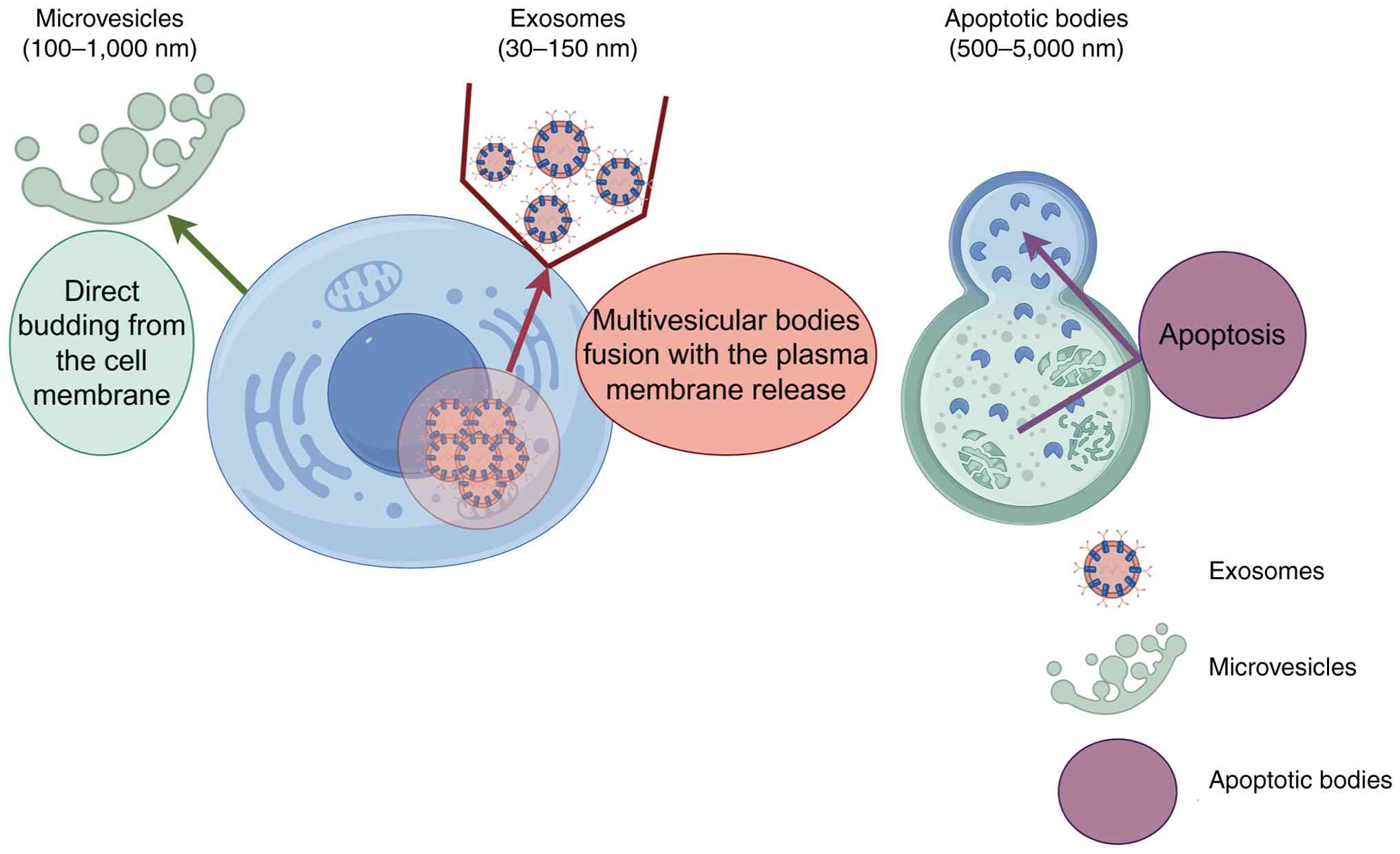 In 1946, Chargaff and West (21) identified a coagulation factor resembling thromboplastic protein in the blood of patients with hemophilia and bleeding disorders, which is considered the starting point of the field of EV biology. Currently, EVs are categorized into three types based on their diameter and release mechanisms: Exosomes (30–150 nm), microvesicles (100–1,000 nm) and apoptotic bodies (500–5,000 nm), exosomes, which are released upon fusion of multivesicular bodies with the plasma membrane; microvesicles, which bud directly from the plasma membrane; and apoptotic bodies, which are generated during apoptosis via cell membrane blebbing. These three types of vesicles differ in size, formation mechanisms and biological functions, collectively serving as important mediators of intercellular communication (Fig. 1). Exosomes, a type of EV, were identified in 1981 by Trams et al (22) in the supernatant of cultured sheep reticulocytes. In 1987, Johnstone et al (23) named them ‘exosomes’. The cellular origin and purity of exosomes serve a key role in processes such as the occurrence, metastasis and drug resistance of PC. Therefore, the development of efficient and specific techniques for the isolation and extraction of exosomes is of notable importance for research on the mechanisms of PC and its clinical applications. Several exosome isolation techniques have been developed to date, including ultracentrifugation (24), ultrafiltration (25), size-exclusion chromatography (26), precipitation-based isolation (27), immunoaffinity capture (28) and microchip-based technology (29). Each of these techniques has its own principles, advantages and disadvantages (30). However, each technique has certain limitations and fails to meet the expectations of being efficient, high in purity, simple and low in cost. Therefore, the effective, accurate and efficient isolation of high-purity exosomes remains a major challenge (31).