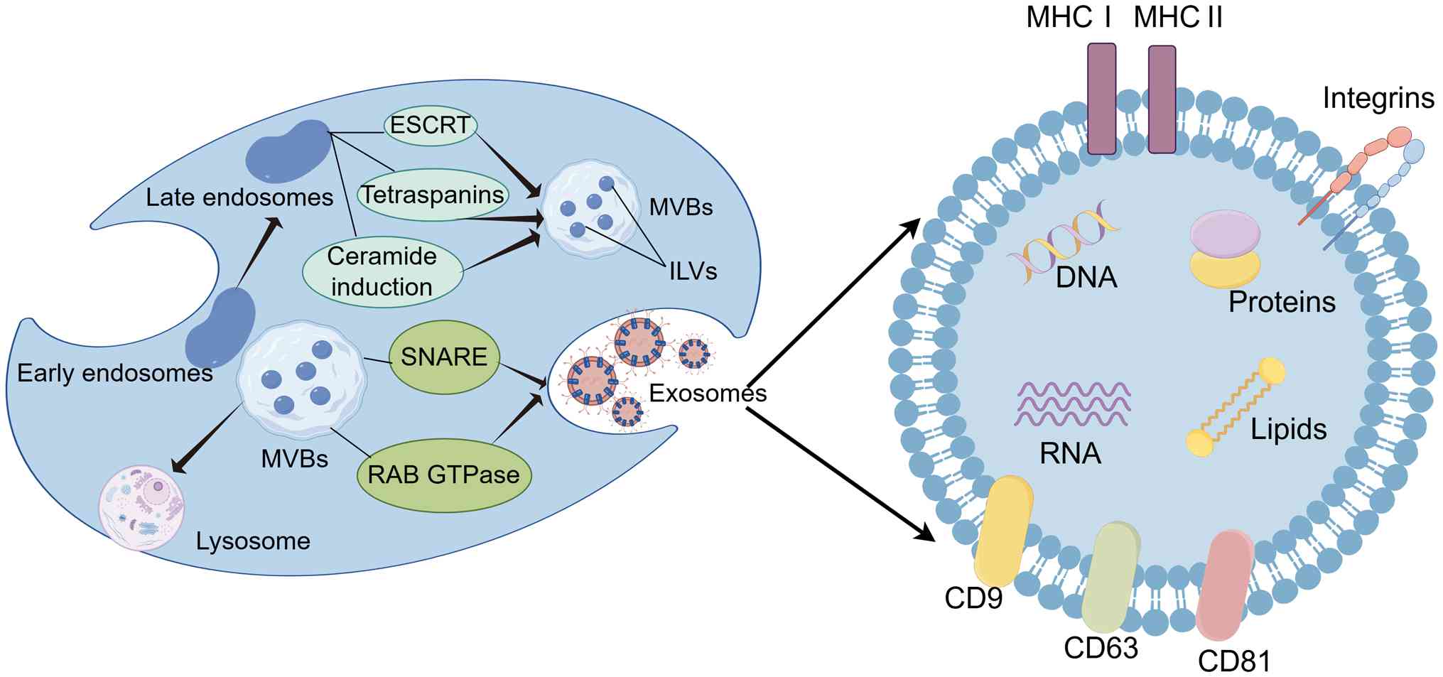 The biogenesis and synthesis of exosomes is a complex process, which begins with endocytosis at the cell membrane surface, where early endosomes are formed through inward budding. Over time, early endosomes mature into late endosomes. Late endosomes primarily form intraluminal vesicles (ILVs) through three pathways: Endosomal sorting complex required for transport, tetraspanin proteins and ceramide induction, and these ILVs gradually develop into multivesicular bodies (MVBs) (32–34). Subsequently, most MVBs fuse with lysosomes, leading to the degradation of ILVs, while a small number of MVBs fuse with the plasma membrane and release exosomes into the extracellular environment (32,35,36). Exosomes carry a rich cargo of lipids, proteins and nucleic acids. The lipid components in exosomes include cholesterol, sphingomyelin, glycosphingolipids, phosphatidylserine, phosphatidylinositol, phosphatidic acid and ceramide (37). Common proteins in exosomes include those associated with membrane transport, such as Ras-related in brain GTPases, annexins, flotillins and MVB biogenesis proteins including apoptosis-linked gene 2-interacting protein X (38). Exosomes also contain tetraspanin proteins, including CD9, CD63 and CD81, as well as heat shock proteins (HSP) such as HSP60 and HSP90. The nucleic acid components in exosomes are also highly diverse, such as microRNA (miRNA/miR) and messenger RNA, which were among the first two types identified (39,40), followed by long non-coding RNA (lncRNA), transfer RNA, small nuclear RNA and circular RNA (circRNA/circ) (39,41) (Fig. 2). These RNA not only act as regulators of gene expression but also serve as potential biomarkers (42). For instance, miR-141 can be detected in the blood of patients with prostate cancer, and its expression level is correlated with the size and malignancy of the tumor (43). Saliva miR-3679-5p and miR-940 have good discriminatory ability and can be used for the detection of resectable PC, with reasonable specificity and sensitivity (44). Furthermore, lncRNA can be regarded as an independent predictor of pathological cardiac remodeling and diastolic dysfunction in patients with type 2 diabetes (45).