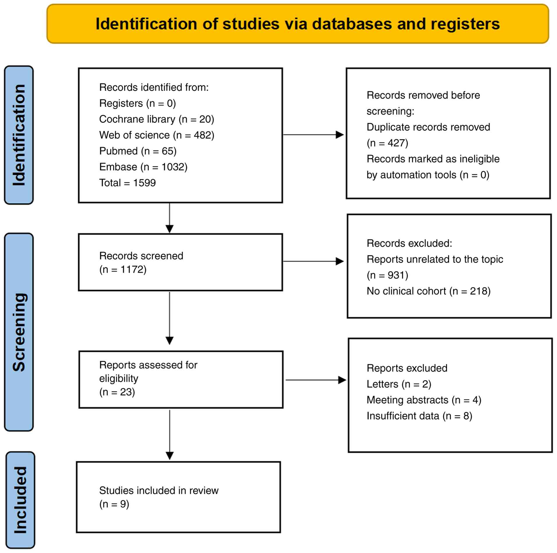 Exclusion criteria: i) Duplicate publications; ii) systematic reviews, narrative reviews, editorials, commentaries and preclinical studies; iii) case reports or conference abstracts lacking full outcome data; iv) they lacked essential outcome data of interest even after attempting to contact the corresponding authors.