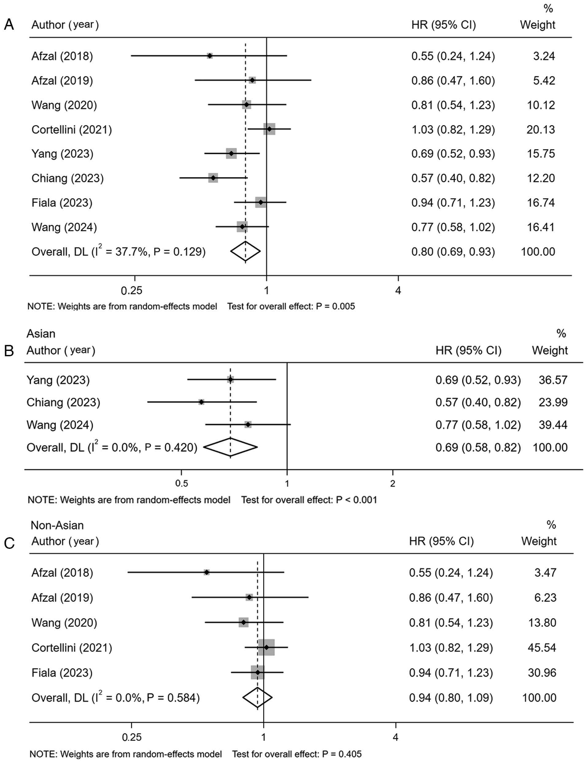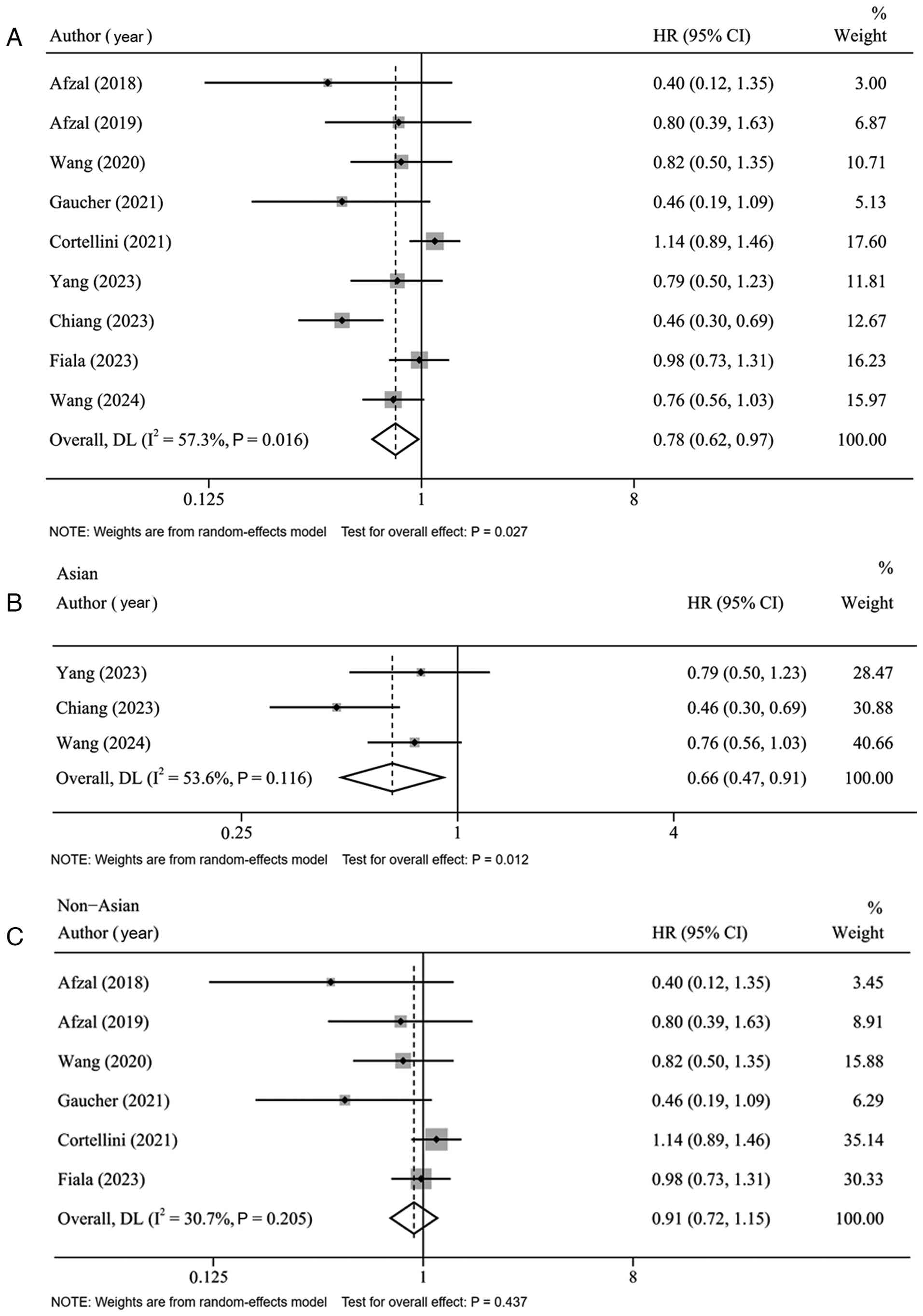 A total of 9 studies were included in the analysis for the OS endpoint. The combined analysis revealed that the addition of metformin to immunotherapy was associated with a significant improvement in OS, yielding a pooled HR of 0.78 (95% CI: 0.62–0.97; P=0.027) (Fig. 3A). Subgroup analysis based on geographic region demonstrated a pronounced OS benefit among Asian patients (HR=0.66, 95% CI: 0.47–0.91; P=0.012) (Fig. 3B), while no significant improvement was observed in non-Asian cohorts (HR=0.91, 95% CI: 0.72–1.15, P=0.437) (Fig. 3C).