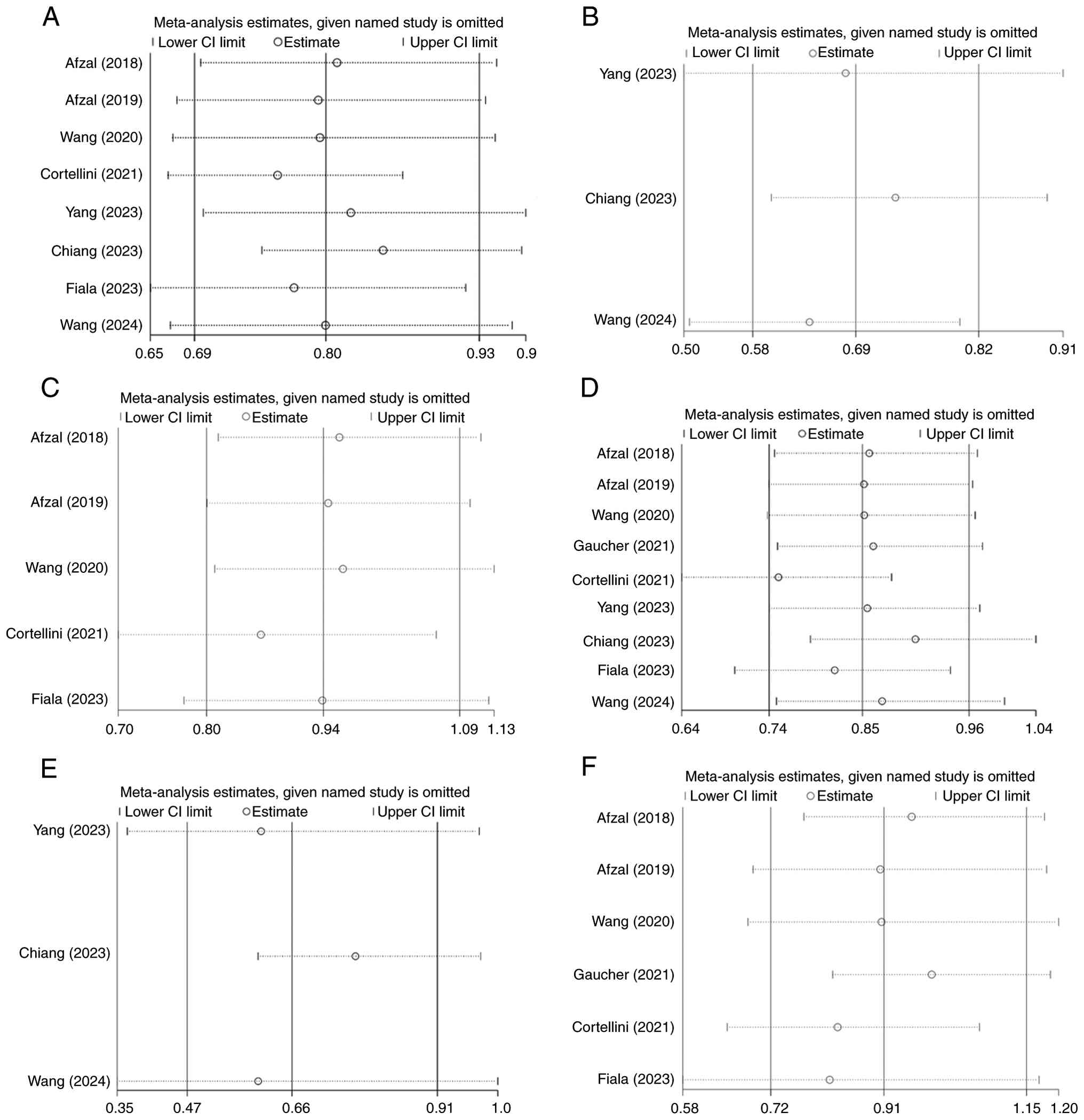 Potential publication bias was evaluated using a funnel plot inspection and Begg's rank correlation test. The Begg's test result was not statistically significant (P>0.05), and the funnel plot showed approximate symmetry. These findings suggest that publication bias is unlikely to have substantially influenced the overall results of this meta-analysis (Fig. 4). A sensitivity analysis was performed to assess the robustness and stability of the pooled results. This was conducted using the leave-one-out method, which involves iteratively removing each individual study and recalculating the summary effect size for the remaining studies. The results demonstrated that no single study exerted a disproportionate influence on the overall effect estimate. This confirms that the meta-analytic findings are robust and not unduly dependent on any particular study included in the analysis (Fig. 5).