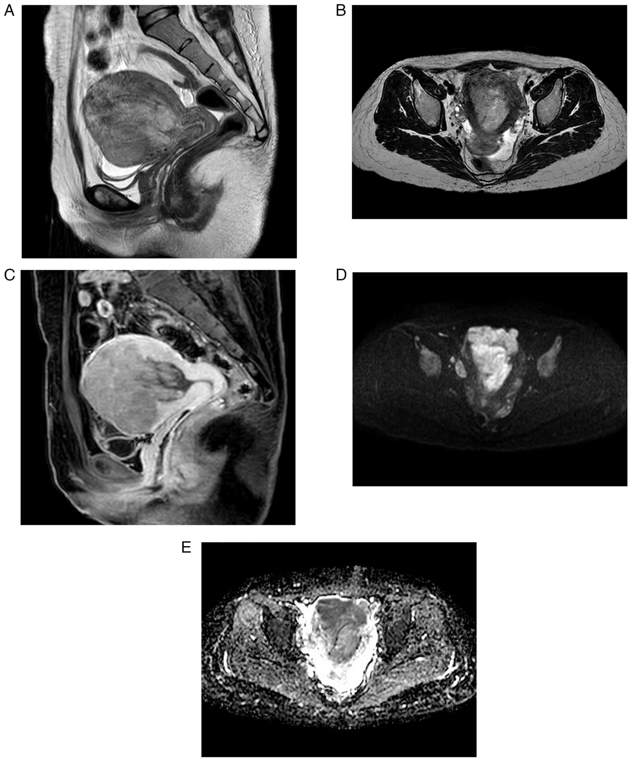 A 21-year-old woman presented with continuous uterine bleeding. When ultrasound revealed a tumor in the uterine cavity, she was referred to our institution for further evaluation. Relevant family history included a paternal grandmother who had suffered breast and peritoneal cancer, and prostate cancer in a maternal grandfather and a maternal uncle. The patient's laboratory results identified severely low hemoglobin levels (5.5 g/dl). Her hormone levels, including estradiol, luteinizing hormone, follicle-stimulating hormone, and prolactin, were within normal limits. Her levels of lactate dehydrogenase (330 U/l) and cancer antigen (CA) 19-9 (81.6 U/ml) were mildly elevated. Other tumor markers, including CA125 and carcinoembryonic antigen, were within normal limits.