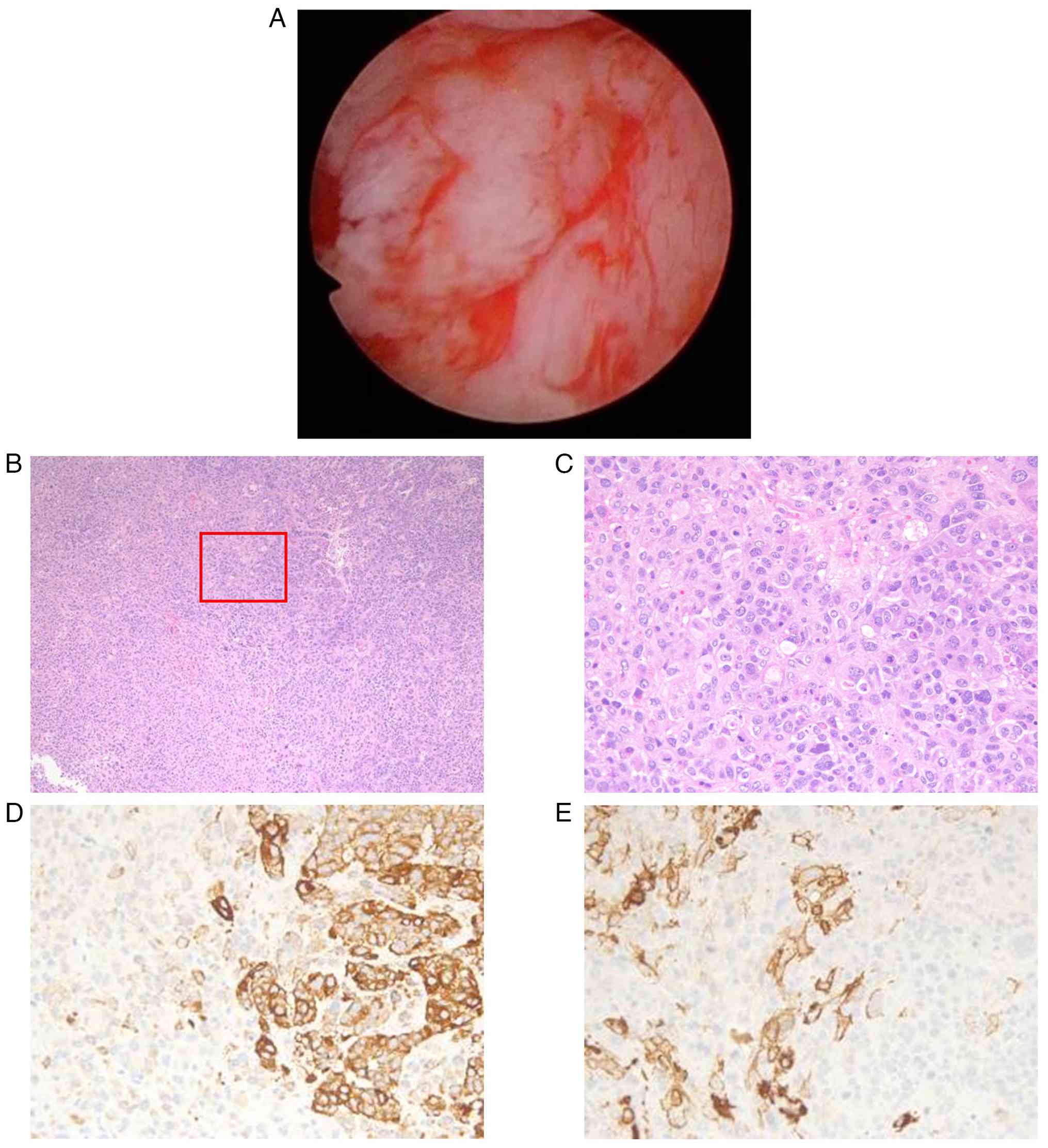 Pelvic magnetic resonance imaging revealed an irregular mass with mild contrast enhancement and restricted diffusion. This protruded from the myometrium into the uterine cavity (Fig. 1A-E). As both cervical and endometrial cytology were negative, a hysteroscopic biopsy of the tumor was performed. The tumor was white, irregular, and showed neovascularization (Fig. 2A). Endometrial biopsy revealed densely proliferating epithelioid cells with nuclear atypia and prominent mitoses, consistent with poorly differentiated carcinoma. However, atypical polygonal cells were also present. Immunohistochemistry showed reduced epithelial marker expression and weak positivity for smooth muscle markers, raising the possibility of carcinosarcoma (Fig. 2B-E). Computed tomography (CT) revealed para-aortic and pelvic lymph node metastasis and multiple pulmonary metastases (Fig. 3A-C). The patient underwent total hysterectomy with bilateral salpingo-oophorectomy to control genital bleeding and obtain a definitive diagnosis.