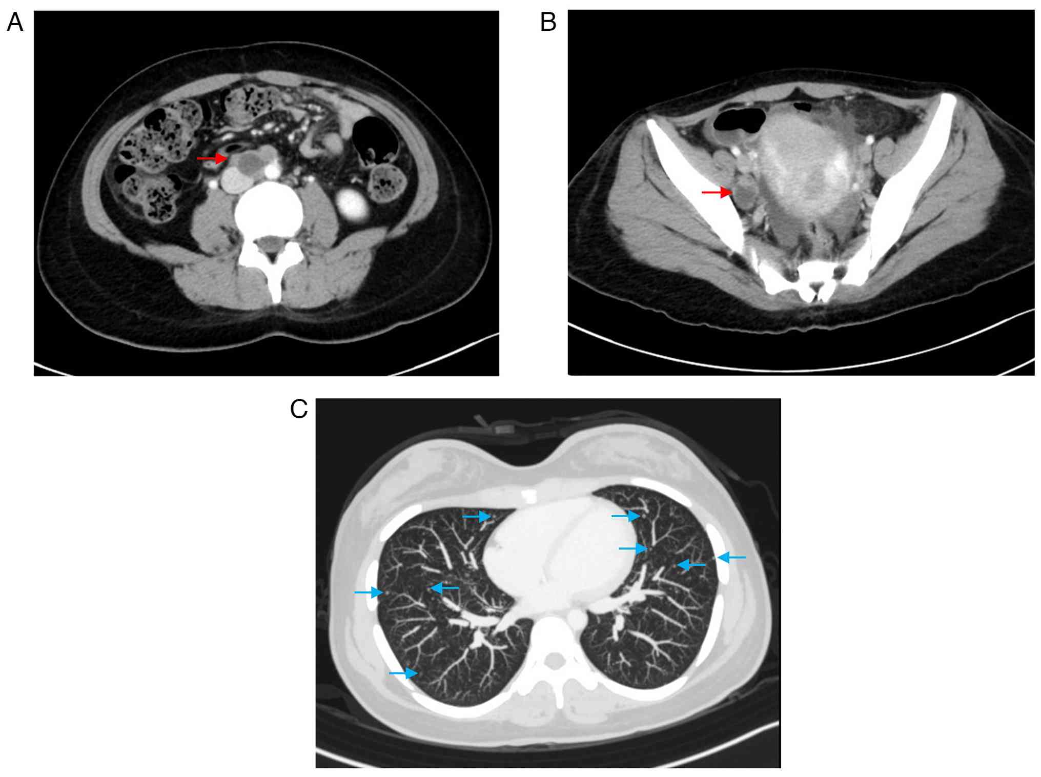 The patient was treated with four cycles of paclitaxel and carboplatin chemotherapy. Subsequently, durvalumab and olaparib were approved for reimbursement under the Japanese national health insurance system for the treatments of endometrial cancer. Therefore, the patient received an additional four cycles of combination chemotherapy with paclitaxel, carboplatin, and durvalumab. Post-chemotherapy CT showed a complete response according to RECIST criteria (Fig. 5A-C). Immunohistochemistry confirmed mismatch repair, and maintenance therapy with durvalumab and olaparib was initiated. The patient has remained progression-free for 10 months.
