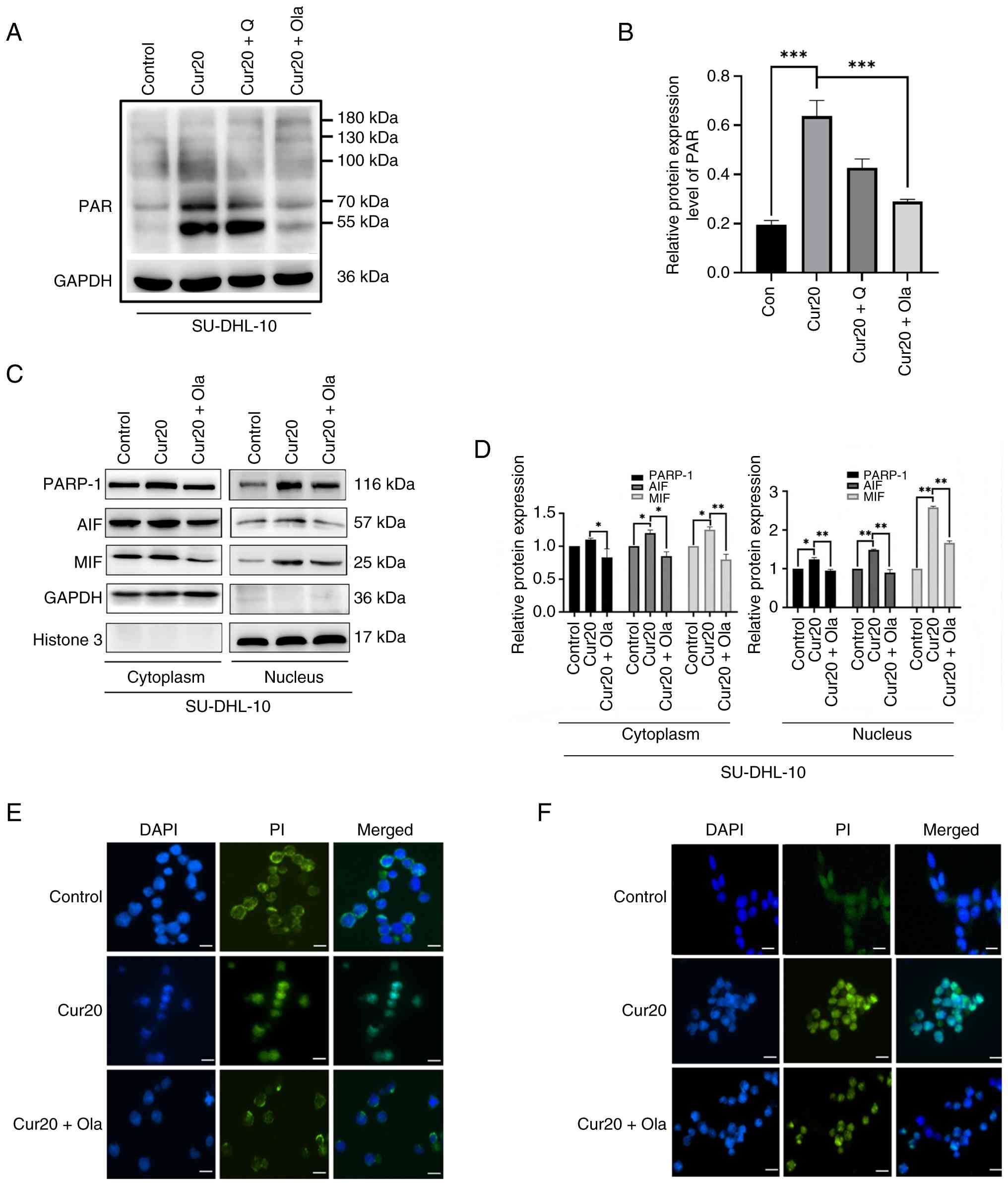 To the best of our knowledge, the present study is the first report demonstrating curcumin-induced activation of the parthanatos pathway in DLBCL cells. Curcumin significantly increased PAR polymer accumulation, an effect that was insensitive to Q-VD-OPh but was potently inhibited by the PARP-1 inhibitor olaparib. Furthermore, curcumin promoted the nuclear accumulation of PARP-1, AIF and MIF. Immunofluorescence analysis confirmed the enhanced nuclear translocation of PARP-1 and AIF, which was attenuated by olaparib treatment These findings align with the established hallmarks of parthanatos (56,57): Namely, cell death associated with excessive PAR polymer formation, which is dependent on PARP-1 activity (58).