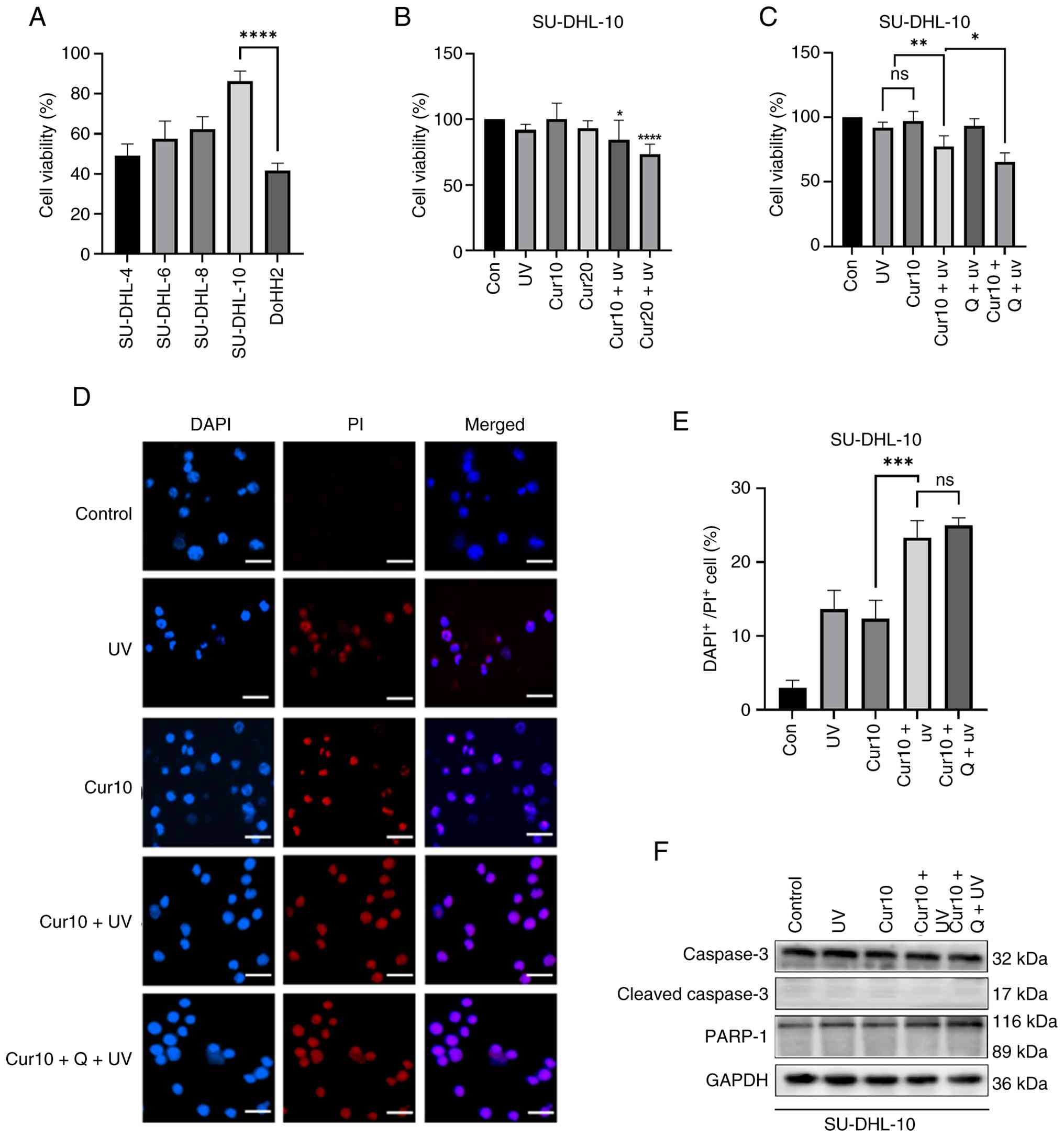 SU-DHL-10 cells are relatively insensitive to DNA-damaging stimuli such as UVB (47) (Fig. 3A). To explore the combined effects of radiotherapy, SU-DHL-10 cells were treated with a low-dose of curcumin and UVB irradiation for 24 h. The CCK-8 assay showed that combined treatment with curcumin (10 or 20 µM) and UVB significantly reduced cell viability compared with single-agent treatments (Fig. 3B). Notably, the addition of Q-VD-OPh to the curcumin (10 µM) and UVB combination further decreased cell survival in the trypan blue exclusion assay (Fig. 3C). DAPI/PI staining confirmed a synergistic increase in cell death with the Cur10 + UV combination, which was not inhibited by Q-VD-OPh (Fig. 3D and E). Western blotting analysis confirmed the absence of cleaved caspase-3 and cleaved PARP-1 in cells treated with curcumin alone or in combination with UVB (Fig. 3F).