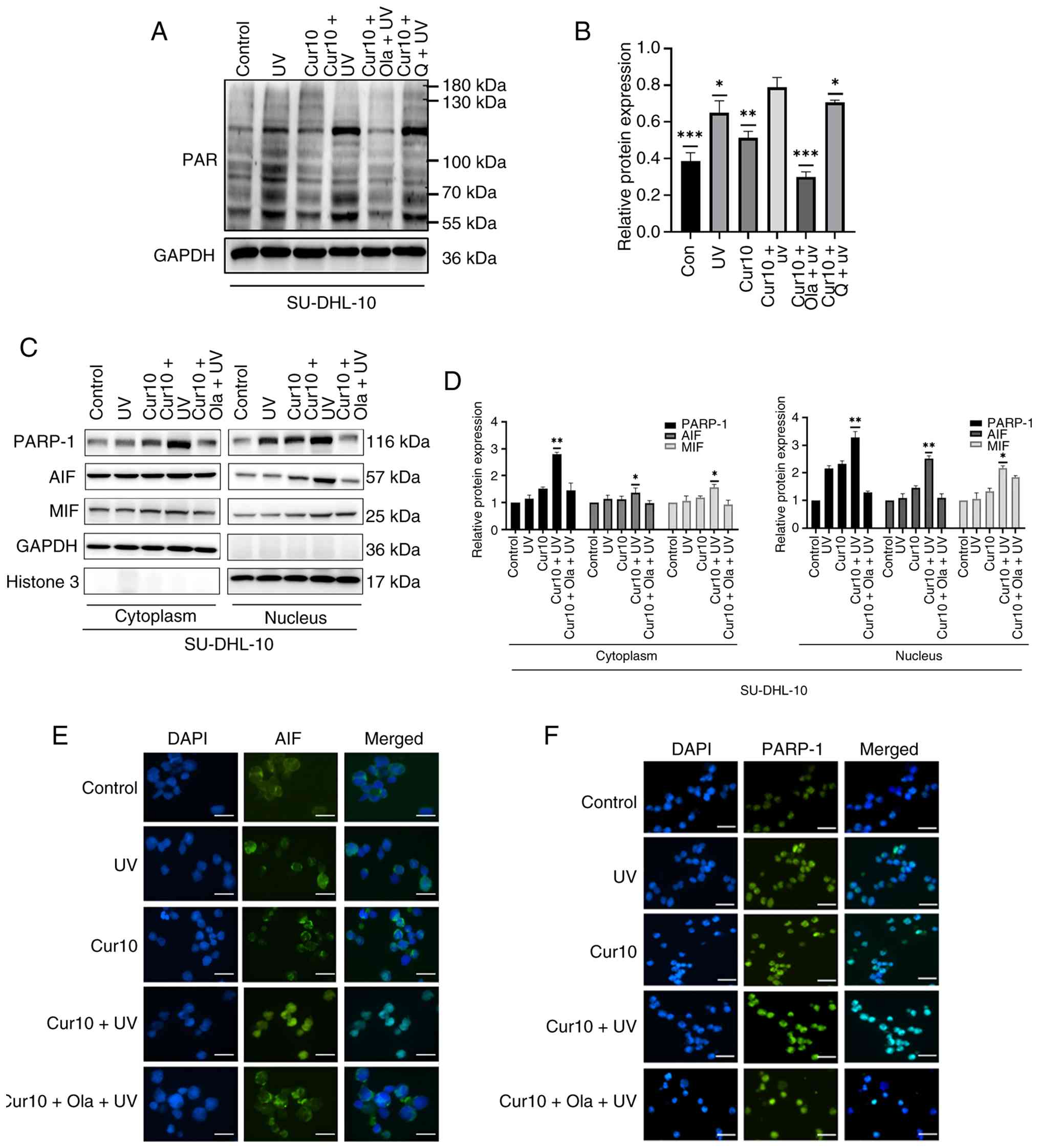To determine whether parthanatos mediated the combined effect, PAR polymer expression was evaluated in SU-DHL-10 cells treated with curcumin and UVB. The PAR polymer levels were significantly higher in the Cur10 + UV group than in either treatment alone. Olaparib, but not Q-VD-OPh, effectively suppressed this increase (Fig. 4A and B). Furthermore, the nuclear levels of PARP-1, AIF and MIF were significantly elevated by the Cur10 + UV combination compared with the single treatments, and this elevation was reversed by olaparib (Fig. 4C and D). Immunofluorescence staining confirmed the enhanced nuclear translocation of AIF and PARP-1 induced by the Cur10 + UV combination, which was inhibited by olaparib (Fig. 4E and F).