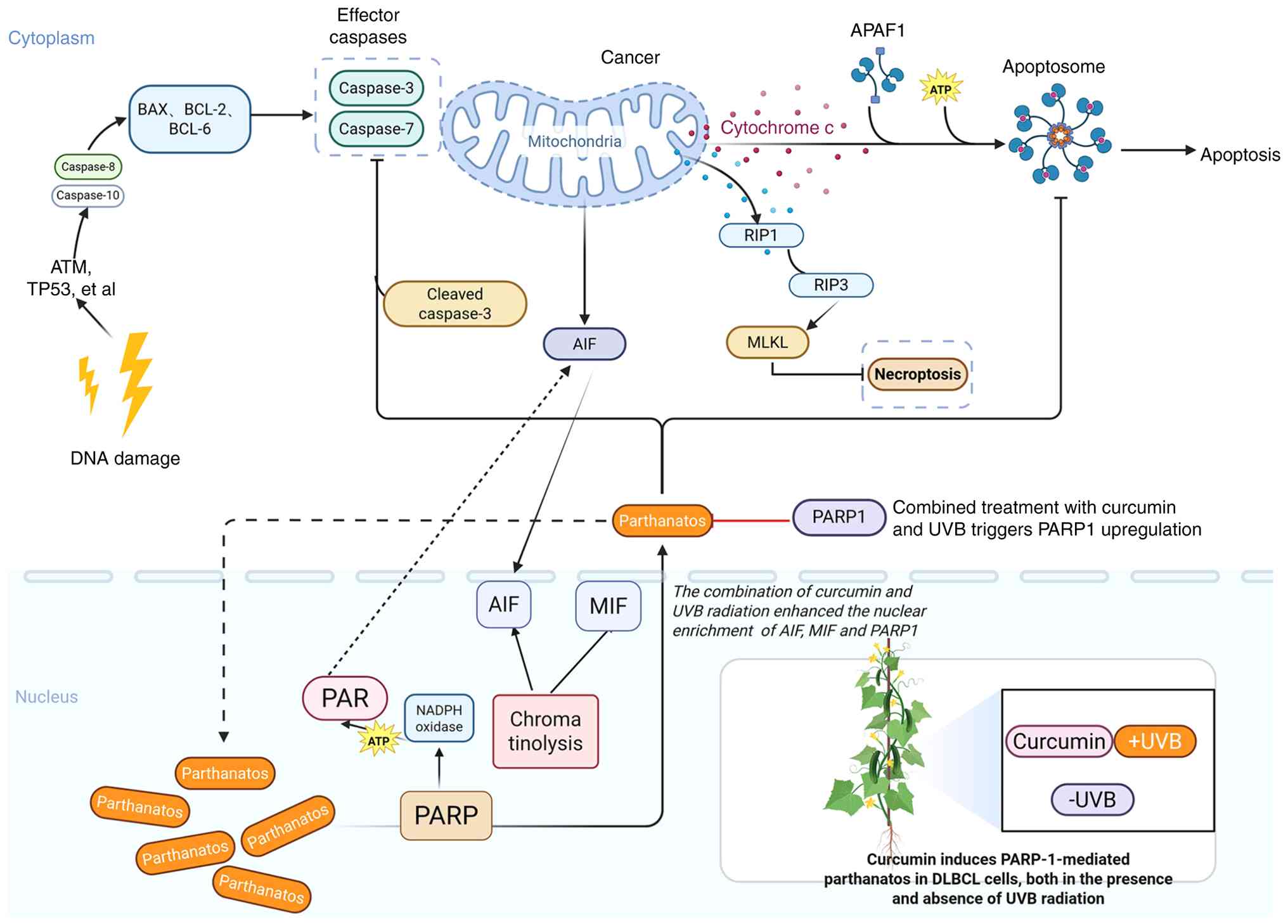 In summary, the present study demonstrated that curcumin induced parthanatos in DLBCL cells through PARP-1 overactivation and AIF/MIF nuclear translocation. Furthermore, it exhibited synergistic cytotoxicity with UVB irradiation (Fig. 5). The present study provides a rationale for exploring parthanatos induction as a novel therapeutic strategy for R/R DLBCL and highlights the potential of curcumin as a radiosensitizer, which warrants further investigation.