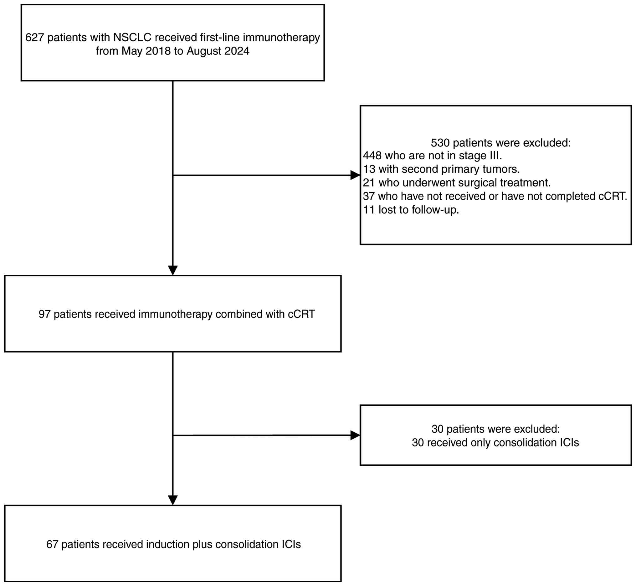 In the present study, a retrospective analysis was conducted to evaluate the efficacy and safety of cCRT followed by immunotherapy consolidation in patients with stage III NSCLC who experienced failure of neoadjuvant chemoimmunotherapy.