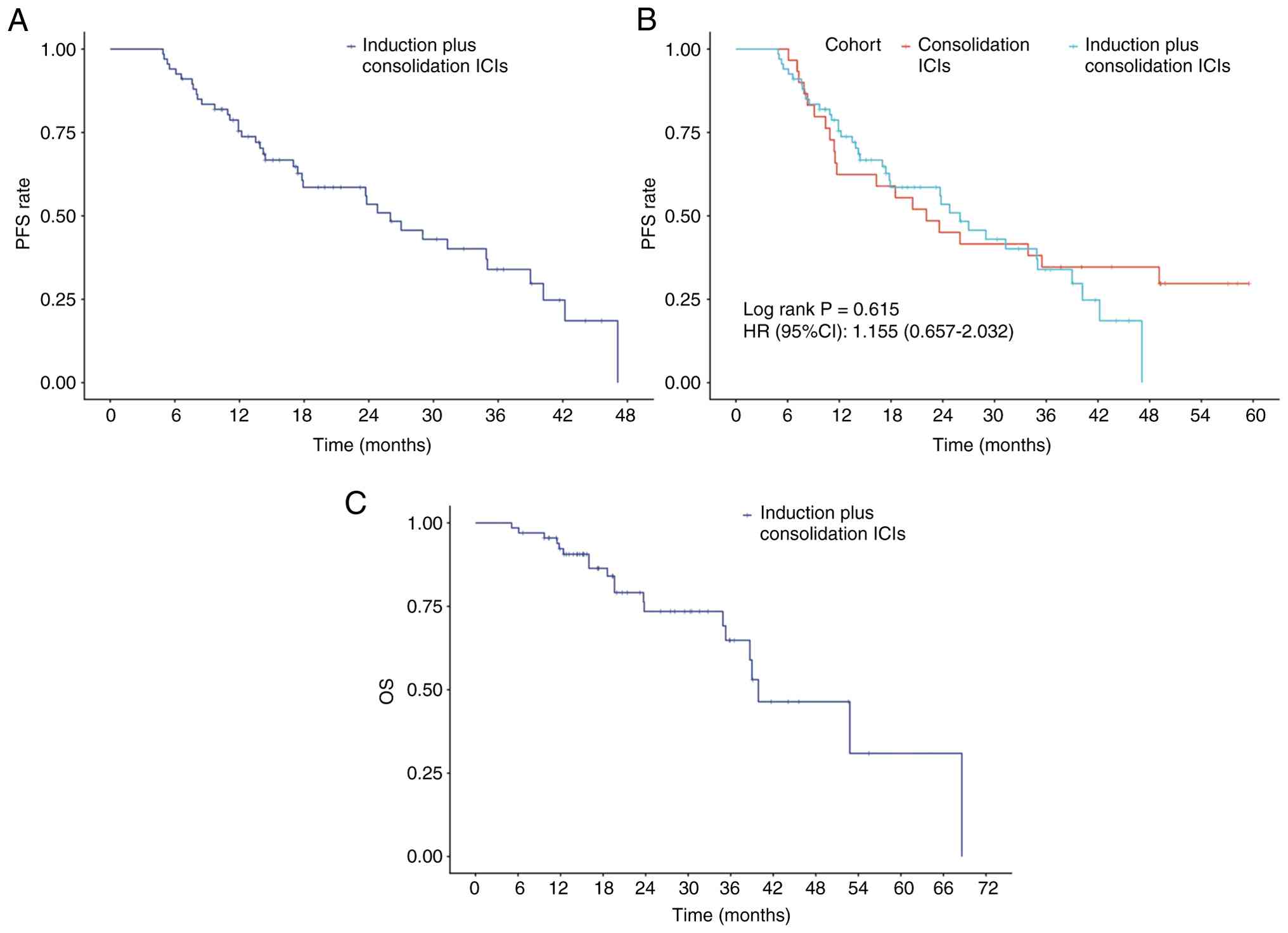 At a median follow-up of 19.4 months, 38 patients (56.72%) had disease progression, and 20 patients (29.85%) had died at the data cutoff (data not shown). The PACIFIC regimen remains the standard treatment for patients with unresectable stage III NSCLC. To evaluate the efficacy of consolidation immunotherapy following cCRT after failure of neoadjuvant chemoimmunotherapy, PFS was compared between patients in this study and previously treated patients at The Second Affiliated Hospital of Nanchang University who received the PACIFIC regimen. The median PFS time was 26.0 months (95% CI, 17.8–39.0) in the induction plus consolidation ICI group (Fig. 2A), compared with 22.1 months (95% CI, 11.7-not reached) in the consolidation ICI-only group. No statistically significant difference was observed between the two groups (HR, 1.155; 95% CI, 0.657–2.032; log-rank P=0.615; Fig. 2B). The 1-, 2- and 3-year OS rates were 92.5, 79.1 and 77.6%, respectively. The median OS time was not reached (Fig. 2C).