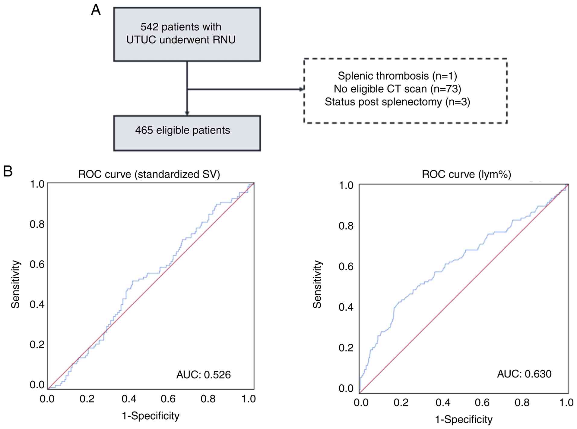 The present analysis expands on existing literature linking splenomegaly to adverse outcomes in solid malignancies. Prior studies have demonstrated that elevated SV is associated with a poor prognosis in hepatocellular carcinoma, pancreatic cancer, gastric cancer, metastatic colorectal cancer and non-small cell lung cancer (17,20,21,24). Consistent with these observations, the present study found that larger baseline SV predicted worse oncological outcomes in UTUC. Importantly, to the best of our knowledge, the present study is the first to evaluate SV in the context of urothelial carcinoma of the upper tract and to integrate peripheral immune status (lym%) as a complementary biomarker.
