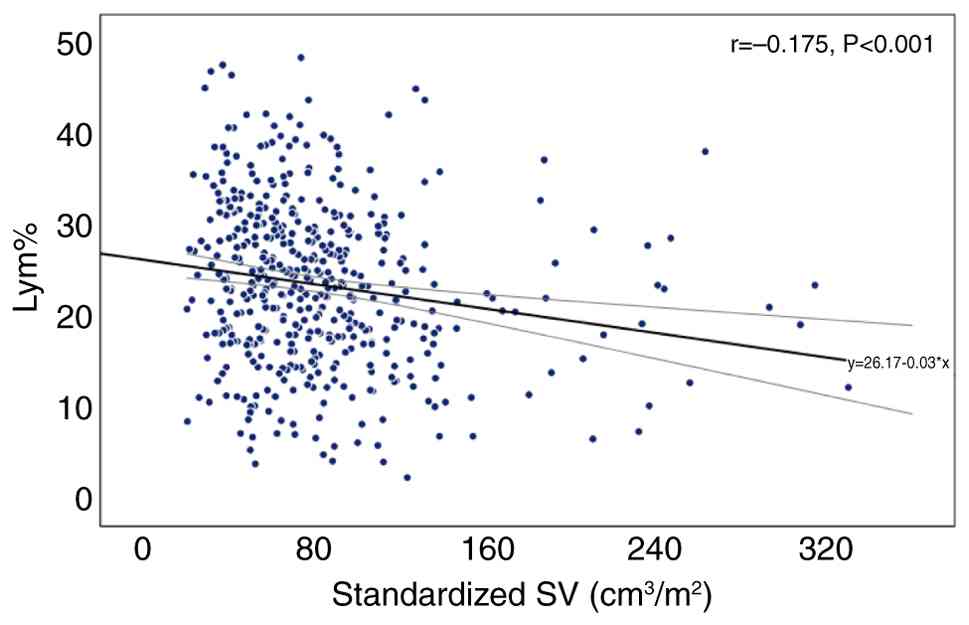 Given that SV is associated with systemic immune status (17,23), the differences in peripheral immune cell counts and percentages between high and low SV were evaluated. Results from a comparative analysis (Table II) showed significantly lower lymphocyte count (P=0.001), lym% (P<0.001) and neutrophil percentage (P=0.001) in patients with high SV compared to those with low SV. No significant difference in platelet count (P=0.167), monocyte count (P=0.959), monocyte percentage (P=0.795), white blood cell count (0.079) or neutrophil count (0.251) was noted. Furthermore, Pearson's correlation showed that the standardized SV was negatively associated with lym% (r=−0.175, P<0.001) (Fig. 2). Additionally, when patients were stratified based on SV and lym%, higher neutrophil percentage showed a trend toward lower lym%, independent of SV (Fig. S2).