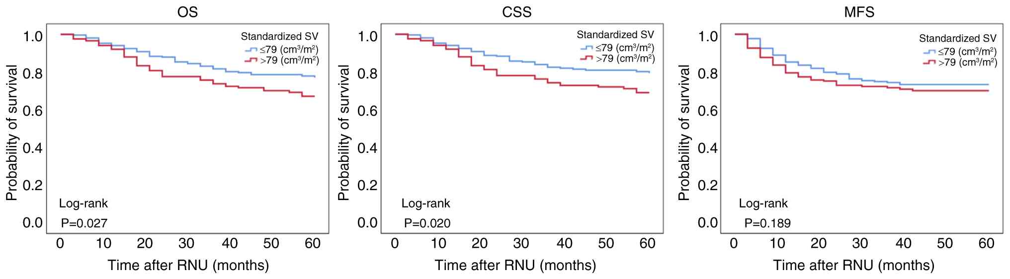 In conclusion, higher standardized SV combined with lower circulating lym% was identified as a novel, independent predictor of worse survival outcomes in patients with UTUC following RNU. These findings suggest that incorporating baseline standardized SV and lym%, alongside established clinicopathological risk factors, can enhance risk stratification and support more individualized postoperative management strategies.