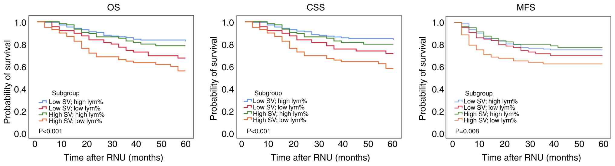 Kaplan-Meier analysis revealed that patients with high SV had significantly shorter OS (P=0.027) and CSS (P=0.020) times, and also showed a non-significant trend toward poorer MFS time (P=0.189) (Fig. 3). Given the observed negative correlation between SV and peripheral lym%, both parameters were further integrated to assess their combined impact on patient outcomes. Patients with high SV and low lym% exhibited significantly worse OS (P<0.001), CSS (P<0.001) and MFS (P=0.008) times compared with those with high SV and high lym%, or low SV regardless of lym% status (Fig. 4).