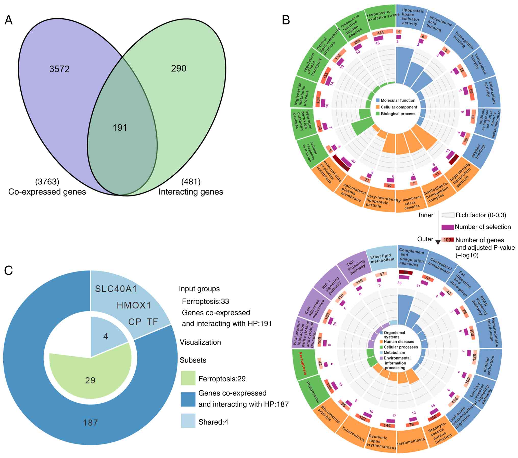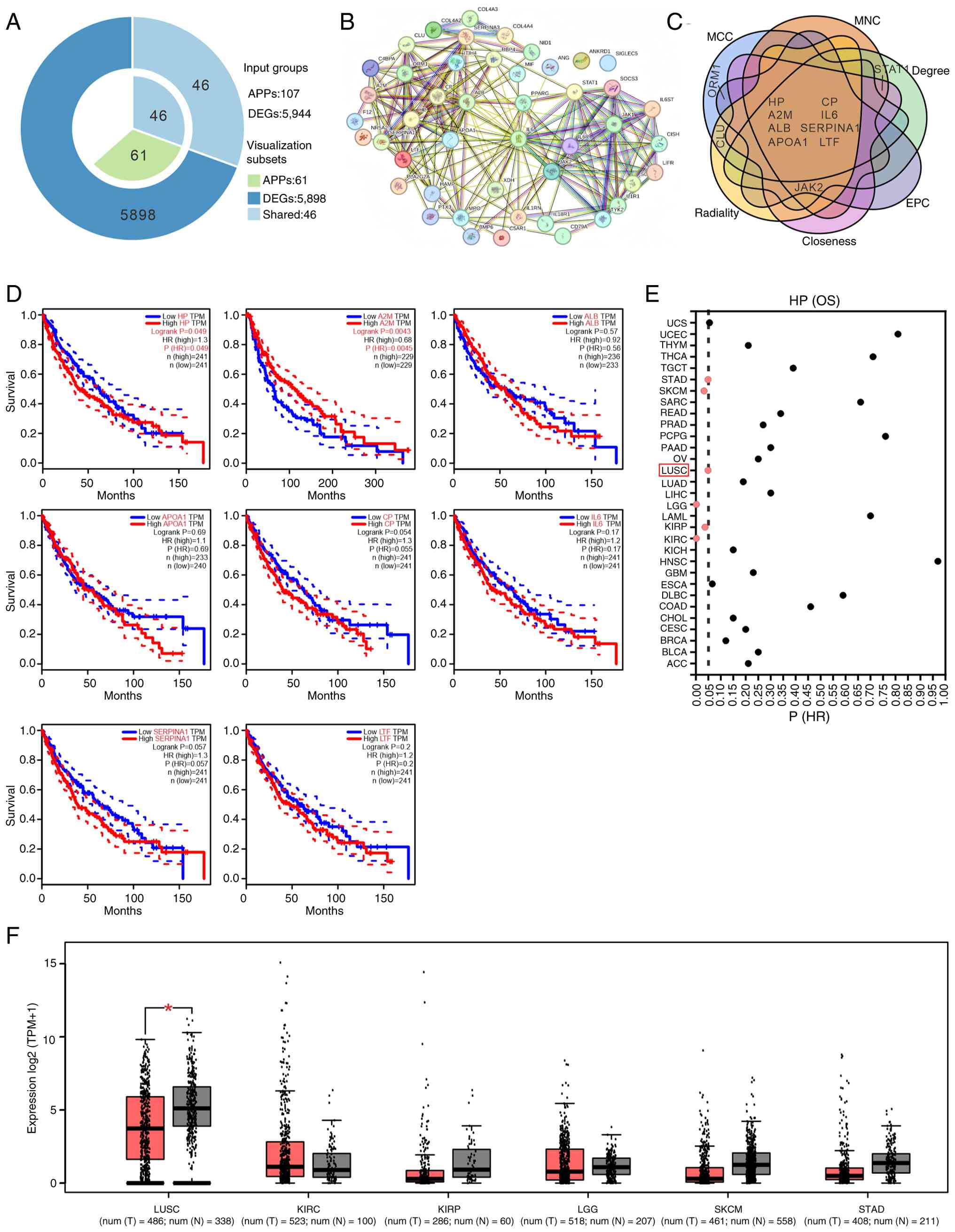 The Gene Expression Profiling Interactive Analysis (GEPIA) database (gepia.cancer-pku.cn) was used to examine the correlation between the expression levels of ALB, A2M, LTF, IL6, HP, CP, APOA1 and SERPINA1 and the prognosis of patients with LUSC based on data from The Cancer Genome Atlas (TCGA; portal.gdc.cancer.gov). Additionally, pan-cancer analysis was performed on the HP gene. Differentially expressed genes (DEGs) between LUSC and normal lung tissues were analyzed using TCGA and Genotype-Tissue Expression data, along with a comparison of HP expression between tumor and normal tissues. A GeneCards database (genecards.org) search for ‘acute phase proteins’ yielded 107 APP genes with relevance scores ≥1. The R package intersect function (version 1.2.0; CRAN.R-project.org/package=dplyr) was used to analyze the intersection between LUSC DEGs and APP genes. Gene interactions were examined using the STRING database (cn.string-db.org), focusing on the top 481 genes interacting with HP. Key node genes were identified using the cytoHubba plugin (version 0.1; Institute of Information Science at Academia Sinica) with six topological network algorithms [Maximal Clique Centrality (MCC), Maximum Neighborhood Component (MNC), radiality, closeness, Edge Percolated Component (EPC) and degree] in Cytoscape software (version 3.9.0; Cytoscape Consortium). Pearson tests in the LinkedOmics database (linkedomics.org) were performed on LUSC samples from TCGA to statistically analyze HP-associated genes, identifying 3,763 genes with a false discovery rate (FDR) <0.001. Using the intersect function from the R package, the intersection between HP-associated genes and HP-interacting genes was assessed. The enrichGO and enrichKEGG functions (version 4.18.4; bioconductor.org/packages/release/bioc/html/clusterProfiler.html) in R (version 4.2.1; R Core Team) were used to determine the Gene Ontology (GO) terms and perform Kyoto Encyclopedia of Genes and Genomes (KEGG) pathway enrichment analysis associated with the HP gene in LUSC. Ferroptosis-related genes were obtained from the KEGG database (genome.jp/kegg). For GO analysis, significance was defined as q-value <0.001 for BP and q-value <0.01 for CC and MF after Benjamini-Hochberg correction, while for KEGG analysis, a q-value <0.05 was considered significant. The LUSC datasets GSE191881 and GSE74706 from Gene Expression Omnibus (GEO; ncbi.nlm.nih.gov/geo), along with gene expression profiles of LUSC tissues and normal lung tissues from TCGA, and relative HP protein expression levels from The Human Protein Atlas database (version 25.0; proteinatlas.org/ENSG00000257017-HP/cancer/lung+cancer#cptac_lung_sqcc), were obtained for analysis. The LM22 gene signature matrix, which contains characteristic genes of M2 macrophages, was obtained from a previous study (23). The infiltration levels of M2 macrophages in LUSC tissues were evaluated using the CIBERSORT (https://github.com/Moonerss/CIBERSORT; accessed in September 2025) algorithm.