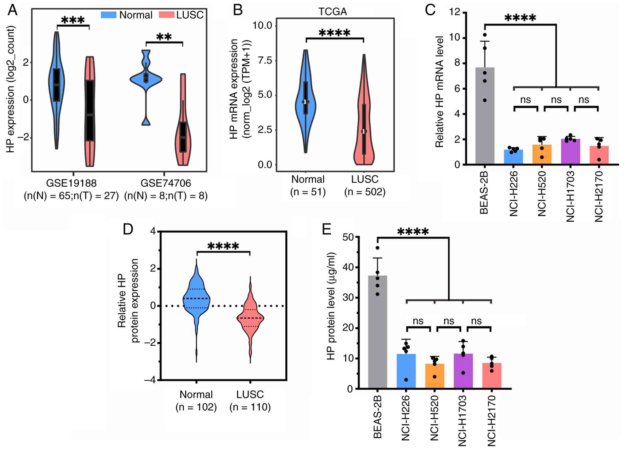 To investigate HP expression in LUSC, gene expression profiles were obtained from GEO and TCGA. Findings from GEO (Fig. 2A) and TCGA (Fig. 2B) revealed a significant downregulation of HP gene expression in LUSC tumor tissues compared with that of normal lung tissues. Subsequent RT-qPCR analysis of HP gene expression in the normal lung epithelial cell line BEAS-2B and LUSC cell lines (NCI-H226, NCI-H520, NCI-H1703, NCI-H2170) showed significant decreases in the LUSC cell lines compared with that of BEAS-2B (Fig. 2C). Examination of the Human Protein Atlas database showed a notable decrease in HP protein expression in LUSC tumor tissues compared with that of normal lung tissues (Fig. 2D). ELISA analysis also confirmed a decrease in HP protein secretion levels in LUSC cell culture supernatant compared with that from the normal lung epithelial cell line BEAS-2B (Fig. 2E). These results indicated a significant downregulation of the HP gene and protein in LUSC tumor tissues and cells.
