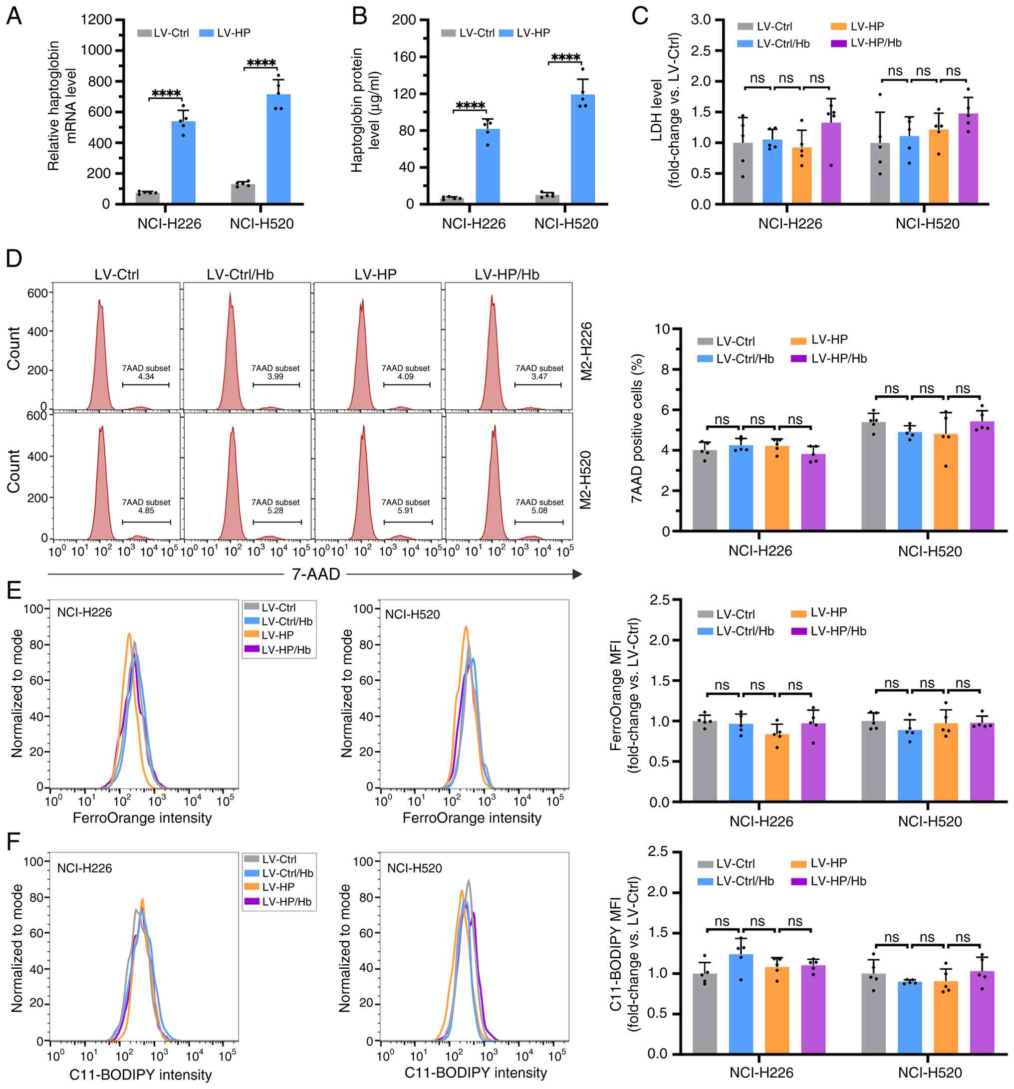 Given the low expression of HP in LUSC cells, lentiviral vectors were constructed to overexpress HP in the NCI-H226 and NCI-H520 LUSC cell lines. After 72 h, cells and culture supernatants were collected to quantify HP mRNA and protein expression using RT-qPCR and ELISA, respectively. Compared with the LV-Ctrl group, LV-HP infection significantly increased HP mRNA (Fig. 4A) and protein (Fig. 4B) expression levels, confirming the successful generation of lentiviral vectors expressing HP for subsequent experiments. Ferroptosis is a form of cell death triggered by iron-dependent lipid peroxidation, which increases membrane permeability (28). To study the influence of HP on membrane permeability in LUSC NCI-H226 and NCI-H520 cells, LDH release and 7-AAD assays were performed in these cells treated with or without LV-HP in the presence or absence of Hb. It was observed that there were no significant differences in LDH release (Fig. 4C) and 7-AAD positive cells (Fig. 4D) among the LV-Ctrl, LV-HP, LV-Ctrl/Hb, and LV-HP/Hb groups. Flow cytometry analysis showed no significant differences in intracellular Fe2+ (Fig. 4E) and lipid peroxides (Fig. 4F) among the cells in the LV-Ctrl, LV-HP, LV-Ctrl/Hb and LV-HP/Hb groups. Thus, it was demonstrated that the overexpression of HP did not induce ferroptosis in the LUSC cells.