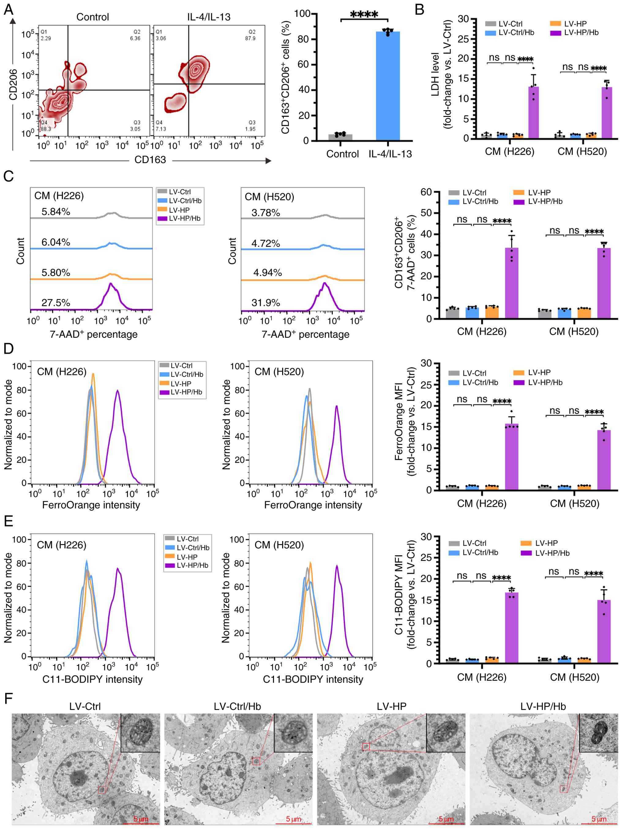 It was next investigated whether the overexpression of HP in LUSC cells induced ferroptosis in M2 macrophages. THP-1 cells were differentiated into M2 macrophages, as confirmed by flow cytometry demonstrating a CD206+CD163+ phenotype in ~80% of cells (Fig. 5A). Subsequently, NCI-H226 and NCI-H520 cells were transfected with lentivirus LV-HP or LV-Ctrl, and the CM was collected. M2 macrophages were exposed to the CM with or without Hb added for 24 h to assess induction of ferroptosis, marked by enhanced membrane permeability attributed to iron-dependent lipid peroxidation. The LDH release assay revealed that the LDH levels were not significantly altered in the supernatant of M2 macrophages exposed to CM from LV-HP-transfected tumor cells, LV-Ctrl-transfected cells and LV-Ctrl-transfected cells with Hb (LV-Ctrl/Hb) (Fig. 5B). Conversely, M2 macrophages cultured in CM from LV-HP with Hb (LV-HP/Hb) exhibited a significant increase in LDH release levels compared with that of the other three groups. Flow cytometry analysis of 7-AAD-positive cells indicated no statistically significant variances among the LV-Ctrl, LV-Ctrl/Hb and LV-HP groups, but a significantly higher percentage of 7-AAD-positive cells in the LV-HP/Hb group (Fig. 5C). Intracellular Fe2+ and lipid peroxide levels in M2 macrophages, measured using FerroOrange (Fig. 5D) and C11-BODIPY respectively (Fig. 5E), showed no significant differences among the LV-Ctrl, LV-Ctrl/Hb and LV-HP groups. However, the LV-HP/Hb group demonstrated a significantly higher fluorescence intensity for both markers, indicating increased free Fe2+ (Fig. 5D) and lipid peroxide (Fig. 5E) levels. Transmission electron microscopy showed ferroptotic characteristics in M2 macrophages from the LV-HP/Hb group, such as decreased mitochondrial size, increased mitochondrial membrane density and a reduction in mitochondrial cristae, with no similar morphological alterations observed in the other three groups (Fig. 5F). Taken together, these findings suggest the CM from lung squamous carcinoma cells overexpressing HP effectively triggered ferroptosis in M2 macrophages in the presence of Hb.