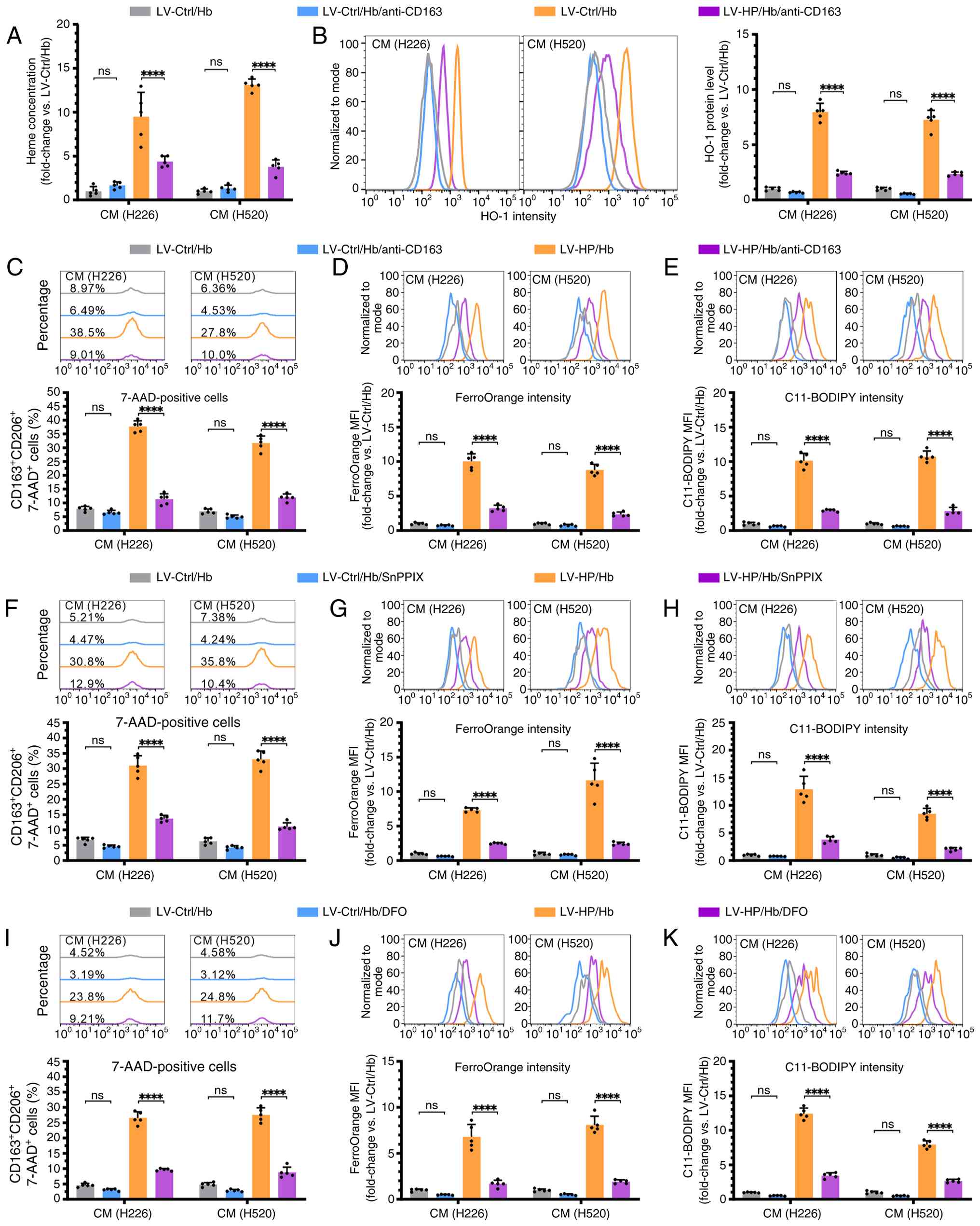 Flow cytometry was used to quantify 7-AAD-positive dead cells, intracellular Fe2+ and lipid peroxide levels, CD163- and CD206-double-positive cells and HO-1-expressing cells. To assess the proportion of 7-AAD-positive cells, and the levels of intracellular Fe2+ and lipid peroxides in NCI-H226 and NCI-H520 cells, cells infected with LV-HP or LV-Ctrl were seeded at a concentration of 2×105 cells per well in 6-well plates, with or without the addition of Hb, and incubated at 37°C for 24 h. To determine the percentage of 7-AAD-positive cells, NCI-H226 and NCI-H520 cells treated as aforementioned were washed with PBS. Subsequently, the cells were resuspended in PBS containing 1 µg/ml 7-AAD (cat. no. 00-6993; Thermo Fisher Scientific, Inc.) and incubated at room temperature in the dark for 10 min. Following trypsin digestion, the cells were washed with PBS, centrifuged at 4°C at 200 × g for 5 min to collect the cells, and the percentage of 7-AAD-positive cells was analyzed using flow cytometry. To determine the concentration of Fe2+, NCI-H226 and NCI-H520 cells, treated as aforementioned, were washed with PBS and then incubated at room temperature in the dark in 1 µmol/l FerroOrange (cat. no. HY-D1913; MedChemExpress) working solution for 30 min. Subsequently, the fluorescence intensity of FerroOrange-stained cells was measured using flow cytometry. The mean fluorescence intensity of each sample was then calculated and compared with the control group. To assess lipid peroxidation levels, NCI-H226 and NCI-H520 cells were treated with LV-HP or LV-Ctrl, washed with PBS, and then incubated in the dark at room temperature with fresh culture medium containing 2 µm BODIPY581/591C11 dye (cat. no. HY-D1301; MedChemExpress) for 30 min. Following trypsin digestion, cells were washed with PBS, collected by centrifugation at 4°C, 200 × g for 5 min, and the fluorescence intensity of BODIPY581/591C11-stained cells was measured using flow cytometry.