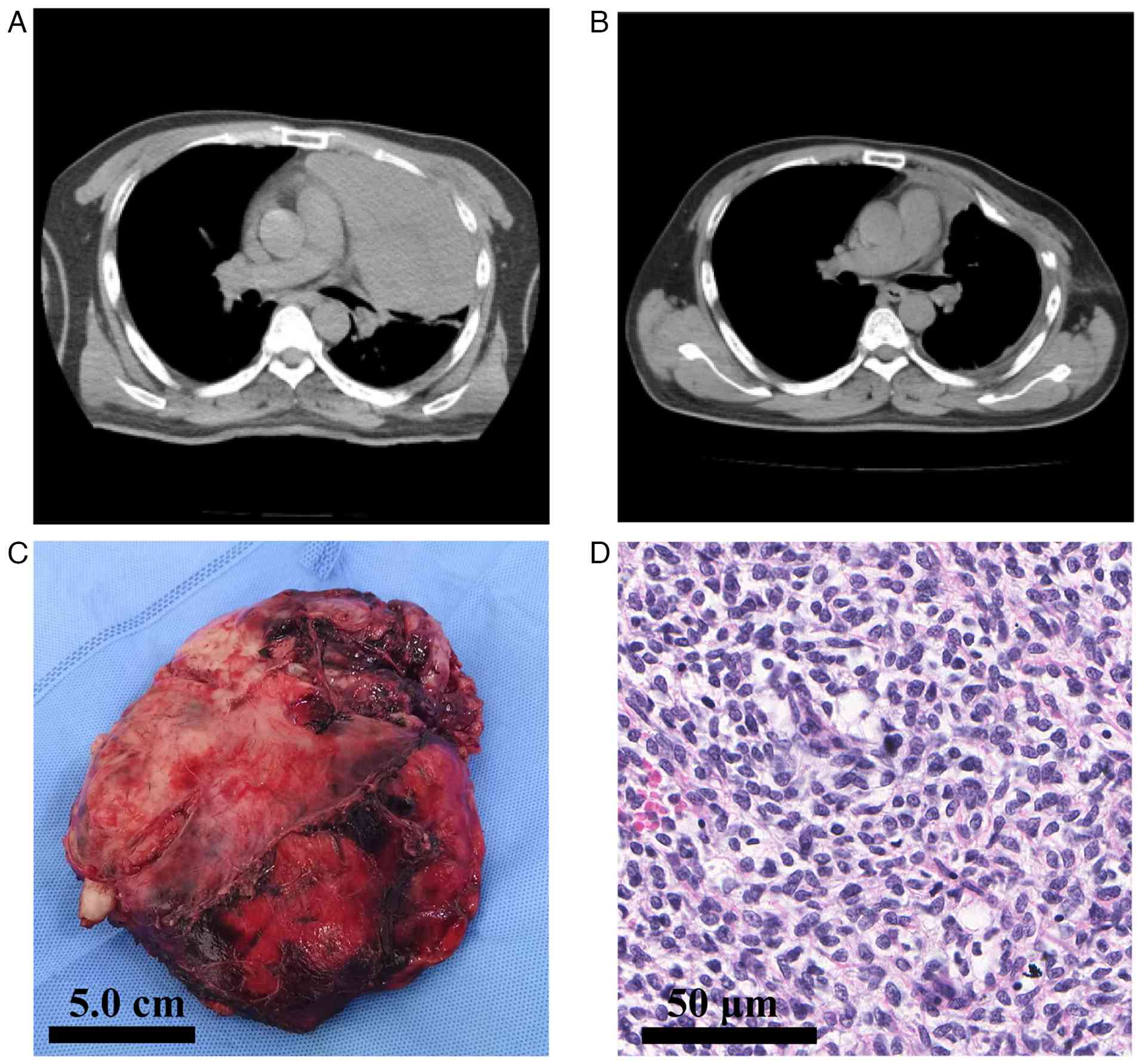 A 45-year-old male presented to The Second Forestry Hospital of Heilongjiang Province (Yichun, China) in April 2021 with persistent chest pain and dyspnea. The patient's medical history was notable for chronic smoking, with no other significant comorbidities. On initial examination, the patient appeared normal but exhibited mild respiratory distress (10). Chest X-ray revealed a large mass in the left hemithorax. Additional imaging with a computed tomography (CT) scan confirmed the presence of a tumor mass measuring 18.5×16.4×9.3 cm, localized to the left thoracic cavity, with broad contact to the parietal pleura but no clear chest wall invasion (Fig. 1A). The preoperative staging work-up included contrast-enhanced chest CT, non-contrast head CT and abdominal ultrasonography. Based on these examinations, no evidence of distant metastasis was detected. A positron emission tomography-CT scan, which could have provided a more comprehensive metastatic survey, was not performed due to the patient's financial constraints. All laboratory tests, including complete blood count; renal, liver and coagulation profiles; and tumor markers (cancer antigen 125, cancer antigen 153 and carcinoembryonic antigen), were within their normal ranges.