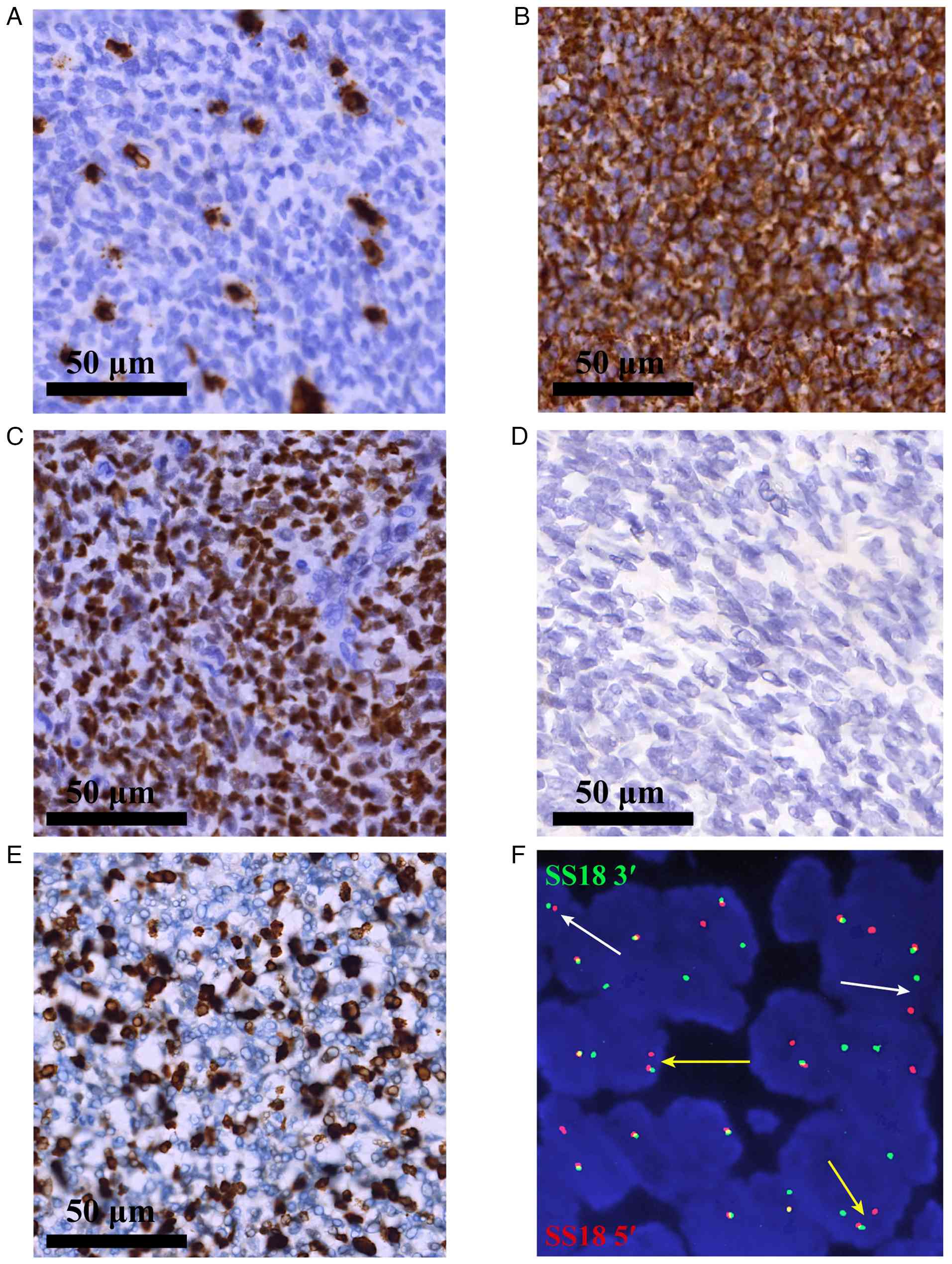 Gross examination of the resected specimen (Fig. 1C) revealed a well-circumscribed, but unencapsulated, greyish-white soft tissue mass measuring 18.5×16.4×9.3 cm in the greatest dimension. The cut surface was solid and tan-white, with focal hemorrhagic areas and ~20% necrosis. Histological examination (Fig. 1D) demonstrated a hypercellular tumor composed of relatively uniform, spindle-shaped cells arranged in intersecting fascicles. The tumor cells exhibited oval nuclei, scant cytoplasm and predominantly monophasic fibrous morphology. Mitotic activity, assessed on H&E-stained sections, was elevated, with an average of 12 mitoses per 10 high-power fields. An extensive IHC panel was performed as described above, using ready-to-use primary antibodies (prediluted 1:100; Fuzhou Maixin Biotechnology Development Co., Ltd.), which revealed diffuse nuclear positivity for transducin-like enhancer of split 1 (TLE1; cat. no. MAB-0686) (Fig. 2C) and membranous positivity for CD117 (c-kit; cat. no. Kit-0029) as well as focal immunoreactivity for epithelial membrane antigen (EMA; cat. no. MAB-1101) and low-molecular-weight cytokeratins [CK (cat. no. RAB-0050) and CK19 (cat. no. MAB-0829)] (Fig. 3A-D). The tumor was entirely negative for STAT6 (nuclear; cat. no. RMA-1066) (Fig. 2D), which effectively ruled out the diagnosis of SFT. A mesothelial marker panel [Calretinin (cat. no. MAB-0716), Wilms tumor-1 (cat. no. RMA-1151), D2-40 (cat. no. MAB-0567) and CK5/6 (cat. no. RMA-1144)] also yielded a negative result, excluding the diagnosis of sarcomatoid mesothelioma (Fig. 4A-D). The Ki-67 (cat. no. RMA-0542) proliferative index was ~30%, indicating a moderately high rate of cell proliferation (Fig. 2E) (13,14). The surgical margins were positive for tumor cells (R1 resection), with the closest margin measuring <1 mm at the mediastinal aspect. The diagnosis was confirmed cytogenetically by fluorescence in situ hybridization (FISH) using the Vysis SS18 Break Apart FISH Probe Kit (Abbott Molecular), performed strictly according to the manufacturer's protocols. The analysis revealed a rearrangement of the SS18 (SYT) gene locus in 80% of the nuclei assessed, and thus, fusion-specific SS18-SSX IHC was not performed (Fig. 2F). Pathological staging of the tumor was T4G3NxM0, which is classified as stage III according to the American Joint Committee on Cancer staging system (15,16).