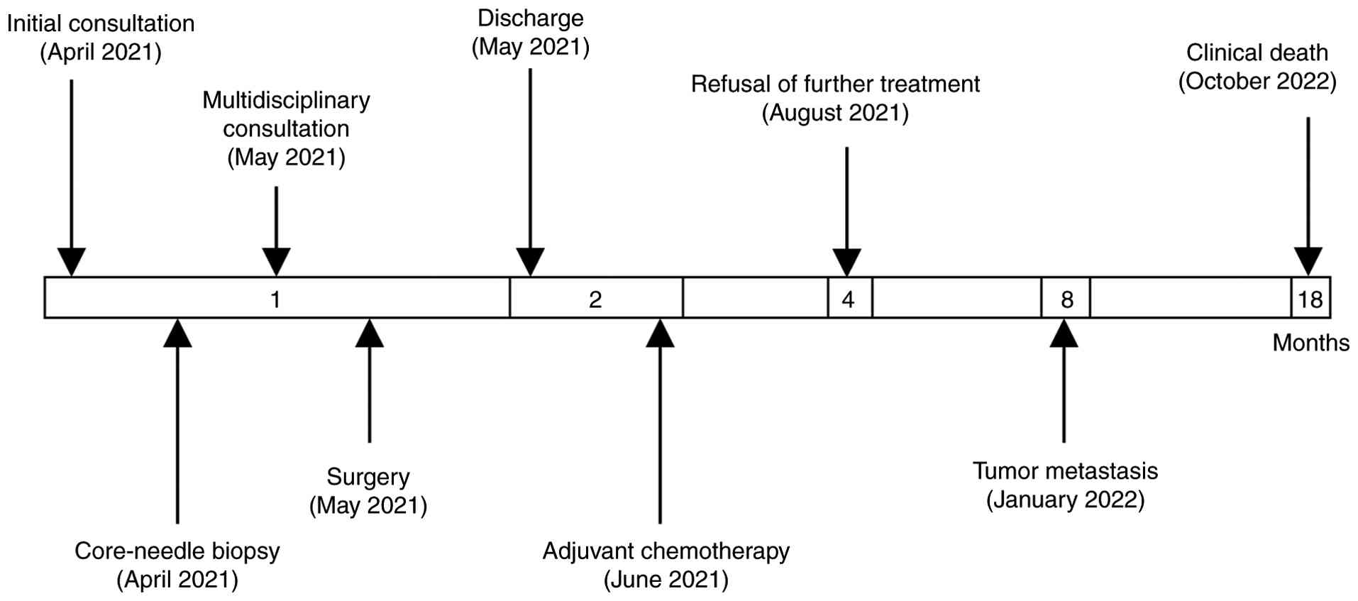 The patient's postoperative recovery was uneventful. A follow-up chest CT scan demonstrated improved expansion of the left lung (Fig. 1B), and the chest tube was removed on postoperative day 5 once drainage decreased to <100 ml per day. In light of the high-risk pathological features (M0 by preoperative imaging, T4G3NxM0 and stage III disease with R1 resection), the multidisciplinary tumor board recommended a comprehensive adjuvant strategy consisting of radiotherapy to the tumor bed followed by systemic chemotherapy (17). Chemotherapy was commenced on postoperative day 21 with a 6-cycle regimen of doxorubicin (70 mg/m2) and nedaplatin (50 mg/m2). However, the patient discontinued treatment after 3 cycles due to grade 2 nausea and fatigue, exacerbated by personal and financial constraints. The total cost of the initial surgical resection was contained under $3,000, reflecting these substantial financial limitations. The rationale for adjuvant radiotherapy was thoroughly explained to the patient to mitigate the high risk of local recurrence; however, despite counseling, the patient declined this intervention. At 8 months after surgery, the patient was re-admitted with persistent cough and cachexia; repeat CT imaging revealed multiple bilateral pulmonary nodules, indicative of widespread metastatic progression (data not shown). The accumulated financial burden was a major factor contributing to the patient's reluctance towards further therapies. The multidisciplinary team discussed evidence-based salvage options, including palliative radiotherapy, second-line systemic agents (such as ifosfamide, trabectedin or pazopanib) and best supportive care. After considering the limited prognosis and potential treatment-related burdens, the patient elected to forgo all further anticancer therapy. The patient died 18 months postoperation. The overall clinical course is summarized in Fig. 5.
