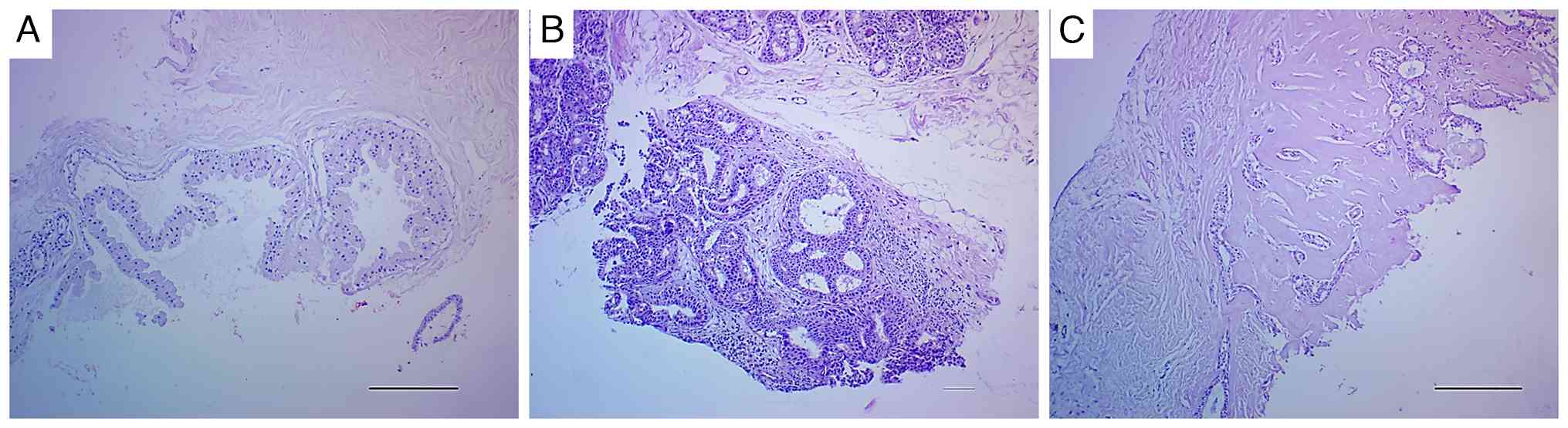 A total of 38 patients met the enrollment criteria; their ages ranged from 26 to 75 years, with a mean age of 45±11.45 years. A total of 12 patients (31.6%) were in the postmenopausal period. The majority of the patients 24 (63.2%), presented with a breast lump, whereas 10 individuals (26.3%) were scheduled for screening. The initial mammography revealed microcalcifications in 12 patients (41.4%) and focal asymmetry in 17 patients (58.6%). Furthermore, 7 patients (18.4%) were referred for further imaging due to the presence of dense breast tissue. The definitive histopathological diagnosis was corroborated through core biopsy in 6 cases (15.8%) and via surgical excision in 32 cases (84.2%). Histopathological evaluation confirmed the presence of malignancy in 26 cases, representing 68.4% of the total, while the remaining 12 cases, accounting for 31.6%, were classified as benign (Fig. 1). Half of the benign lesions were inflammatory (acute and granulomatous mastitis), 4 (33.3%) exhibited fibrocystic changes (Fig. 1A), one of which exhibited atypical ductal hyperplasia and the remaining 2 (16.7%) were benign intraductal papilloma. Among the malignant lesions examined, 12 (46.2%) were classified as ductal carcinoma in situ (DCIS; Fig. 1B), while invasive ductal carcinoma (IDC) accounted for 14 (53.8%; Fig. 1C). Details are presented in Table I.