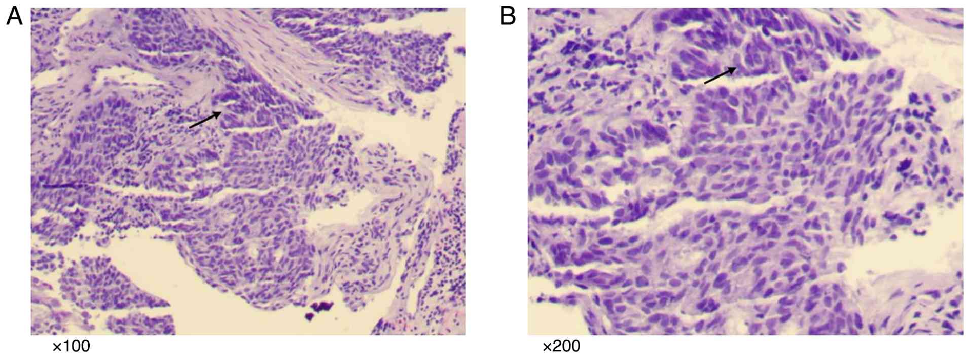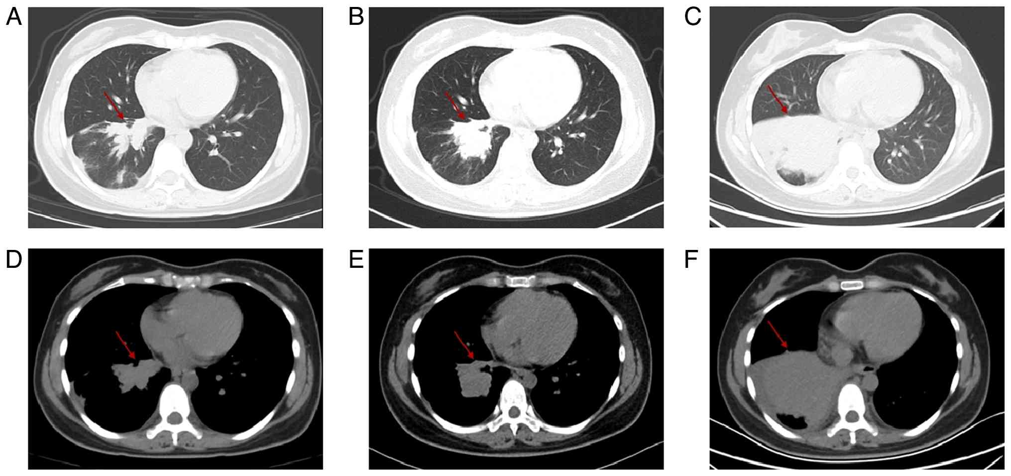 A 25-year-old woman who presented with a cough and bloody sputum without obvious triggers was admitted to The First Affiliated Hospital of Hebei University of Traditional Chinese Medicine (Shijiazhuang, China) in December 2023. Poorly differentiated squamous cell carcinoma of the lower lobe of the right lung was diagnosed after a biopsy was obtained by bronchoscopy. The lung histology showed a large number of abnormally proliferated squamous cells with large and oval nuclei, deeply stained nuclear chromatin, prominent nucleoli and keratinization (Fig. 1; Data S1). Immunohistochemistry (Data S1) revealed the following results: Thyroid transcription factor 1(−), NapsinA(−), AE1/AE3(+), Vimentin(−), p40(+), cytokeratin 5/6(+), CD56(−), Synaptophysin(−), Chromogranin A(−), CD99(+) and CD117(−) (data not shown). Next-generation sequencing (NGS) (Data S1) was performed on Illumina NextSeq550/NovaSeq6000 platform, and the reference genome was GRCh37/hg19. The detection targets include 10 core genes related to lung cancer, including single nucleotide variation, small fragment insertion or deletion, copy number variation and gene fusion of ERBB2 and other genes, which can be used to assist prognosis evaluation and predict the efficacy of targeted drugs. The results showed that the patient had a c.2369C>T (p.T790M) mutation in the EGFR gene, and the mutation frequency was 53.51%. Lymph nodes and distant metastases were not detected at that time. The patient had no previous underlying diseases, and had no history of allergies, blood transfusions or contact with infected water, as well as no known family genetic history. Following the detailed evaluation of the disease by the doctor and the development of a treatment plan, the patient received immunotherapy combined with chemotherapy for a total of 6 cycles (0.2 g tislelizumab on day 1 + 0.2 g nab-paclitaxel on day 2 + 0.3 g carboplatin on day 2, every cycle of 21 days) at The First Affiliated Hospital of Hebei University of Traditional Chinese Medicine between January and April 2024. The condition of the patient was deemed stable in May 2024, and the regimen was adjusted to a total of three cycles of treatment with 0.2 g tislelizumab and 0.5 g carboplatin. In August 2024, an evaluation of disease progression revealed the need for additional chemotherapy. Nab-paclitaxel (0.2 g) were added for a total of two cycles. In October 2024, the regimen consisted of 0.2 g tislelizumab, 30 mg cisplatin, and 0.2 g nab-paclitaxel, administered for one cycle. In November 2024, treatment was continued with 200 mg tislelizumab + 1.4 g gemcitabine + 400 mg carboplatin for one cycle.