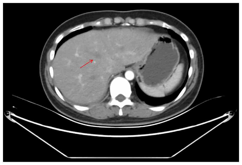 As early as the chest CT scan in January 2024, a soft-tissue mass measuring 3.2×2.5 cm was detected in the lower lobe of the right lung (Fig. 2A and D). However, CT scans of the chest in December 2024 (size, 10×8.4×5.6 cm; Fig. 2C and F) showed that the malignant space in the lower lobe of the right lung was markedly enlarged compared with the previous scan in October 2024 (size, 5.2×3.5 cm; Fig. 2B and E), with multiple ground-glass density nodules of varying sizes in both lungs (the largest diameter of which was ~1.1 cm), multiple enlarged lymph nodes in the right hilar and mediastinal regions, and occlusion of the right lower lung bronchus with obstructive inflammation, as well as thickening of the right lower pleural membrane. Bone destruction of the seventh thoracic vertebra with pathological fracture suggested bone metastasis. CT scans of the abdomen cavity (Fig. 3) showed multiple new lesions in the liver (the largest of which was ~2.7 cm in diameter), suggesting metastases. The imaging suggested that the condition of the patient was in a deteriorating state.