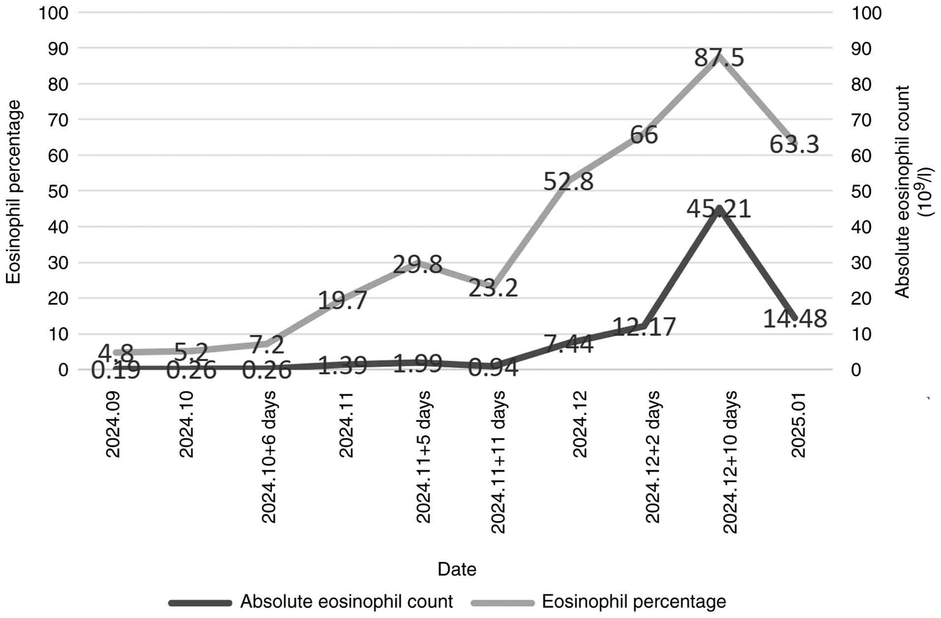 In order to avoid organ damage caused by eosinophilia, intravenous methylprednisolone sodium succinate (20 mg; injection time, 30 min) was immediately administered for anti-inflammatory treatment. After evaluating the condition and tolerance of the patient, the patient was also administered nab-paclitaxel (0.2 g) chemotherapy to treat the tumor, diphenhydramine hydrochloride injection (20 mg) to prevent allergic reactions before chemotherapy and tropisetron hydrochloride injection (5 mg) as an antiemetic. Electrocardiogram, blood pressure and blood oxygen test results were closely monitored. During the past almost 1 year of treatment, the tumor control of the patient had been relatively stable, but the chest CT showed that the tumor was rapidly deteriorating. Coincidentally, the stage of the peripheral blood eosinophilia elevation coincided with the time of tumor deterioration (October-December 2024), and it was hypothesized that eosinophilia was involved in the progression of the lung cancer.
