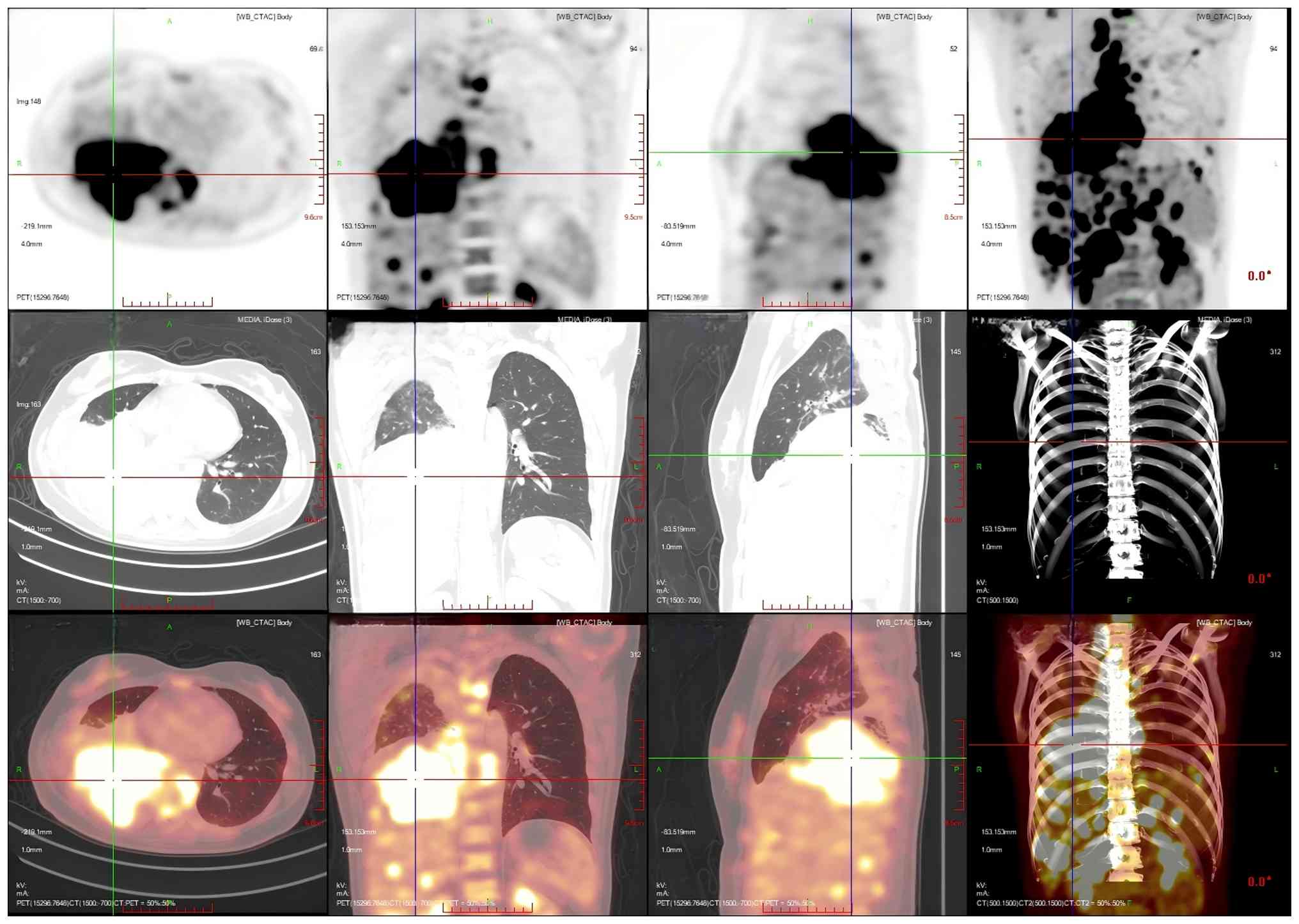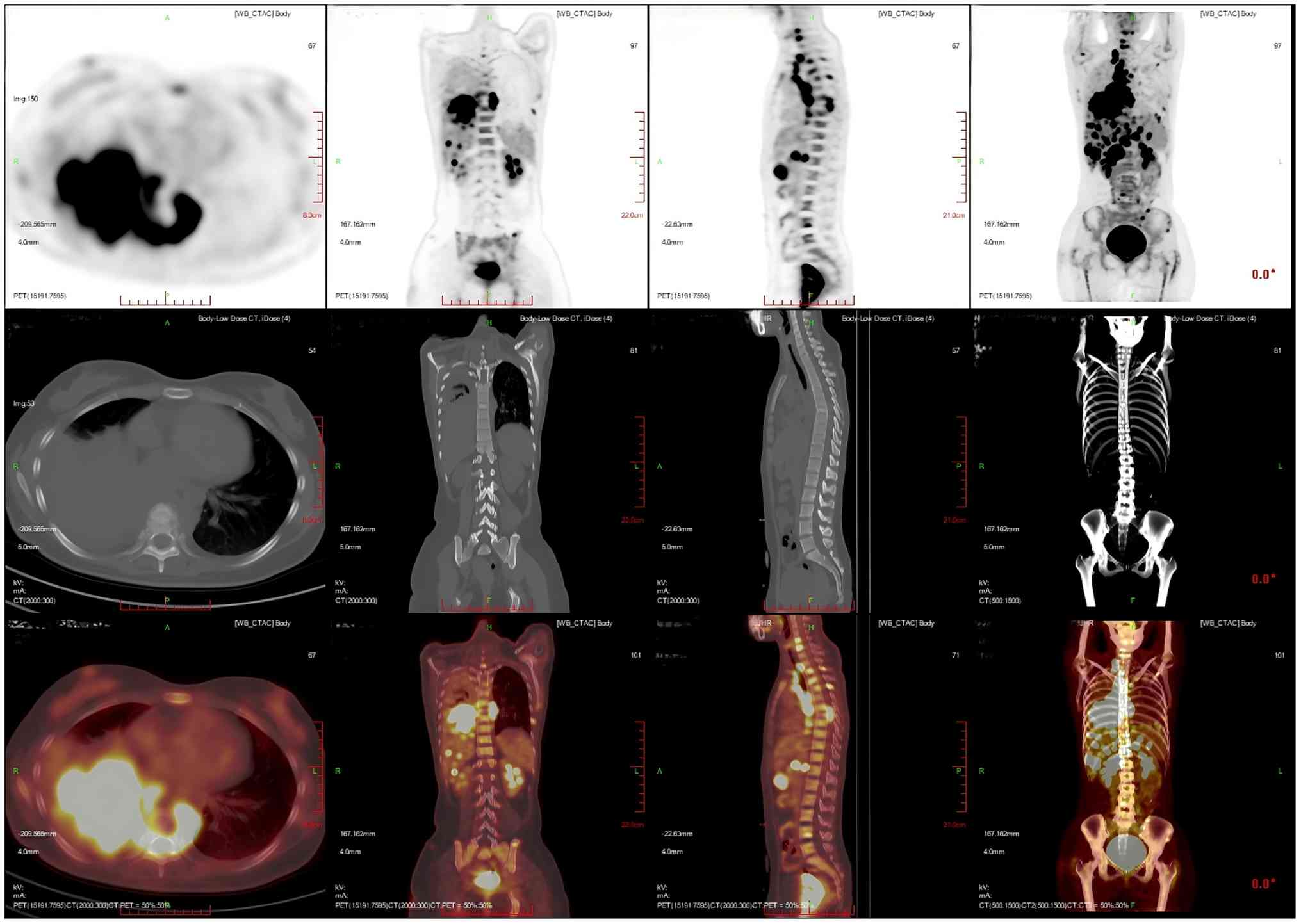 After 1 month, the patient developed numbness and discomfort below the waist, weakness of both lower limbs and limitations to lifting. To clarify the changes in the condition of the patient, positron emission tomography/CT (PET/CT) was performed. PET/CT images showed that an irregular mass-like hyperdense shadow was detected in the right lung hilar and the middle and lower lobes of the right lung; no normal lung tissue was seen, the lesion crossed the interlobular pleura and invaded the upper lobe of the right lung, and the corresponding area on PET showed a mass-like radiolucency focus with an maximum standardized uptake value (SUVmax) of 25.8 (Fig. 5). Multiple enlarged and swollen lymph nodes were detected in the mediastinum, bilateral pulmonary hilar region, bilateral diaphragmatic pedicle and right cardiogenic angle area, partially fused in the form of a mass. PET showed a mass of radiolucent foci in the corresponding areas, and the SUVmax of the hypermetabolic area under the bronchus was measured to be 21.4. Thickening of the right pleura was observed, an arcuate fluid density shadow was seen in the thoracic cavity and mild radiolucent uptake was visible in the area of pleural effusion on the right side of the chest cavity (Fig. 6). The liver was full, with diffuse low-density nodules and masses of varying sizes within it, and PET showed nodular and mass-like radioactivity uptake in the corresponding areas. The low-density mass in the S4 segment of the liver was measured to be ~5.0×4.4 cm in size, with an SUVmax of 20.0. Several enlarged lymph nodes were observed in the portal region of the liver, which had fused to form a mass. PET scans showed mass-like radioactivity uptake in the corresponding areas, with a SUVmax of 20.2 (Fig. 7). Multiple nodular and striated radiographic uptake of the right humeral head, multiple parts of the sternum, bilateral scapulae, cervical, thoracic and lumbar vertebral bodies, part of the accessory bones, the two flanks of the sacrum, multiple parts of the pelvic bone and the proximal segment of the left femur were noted. CT demonstrated an inhomogeneous increase in the density of the bone at the corresponding sites, discontinuity of the cortex in some of the neighboring bones, flattening of the seventh thoracic vertebral body, morphological disorders and an increase in the peripheral soft-tissue shadows. A high metabolic area was measured in the seventh thoracic vertebral body, with an SUVmax of 20.4 (Fig. 8).