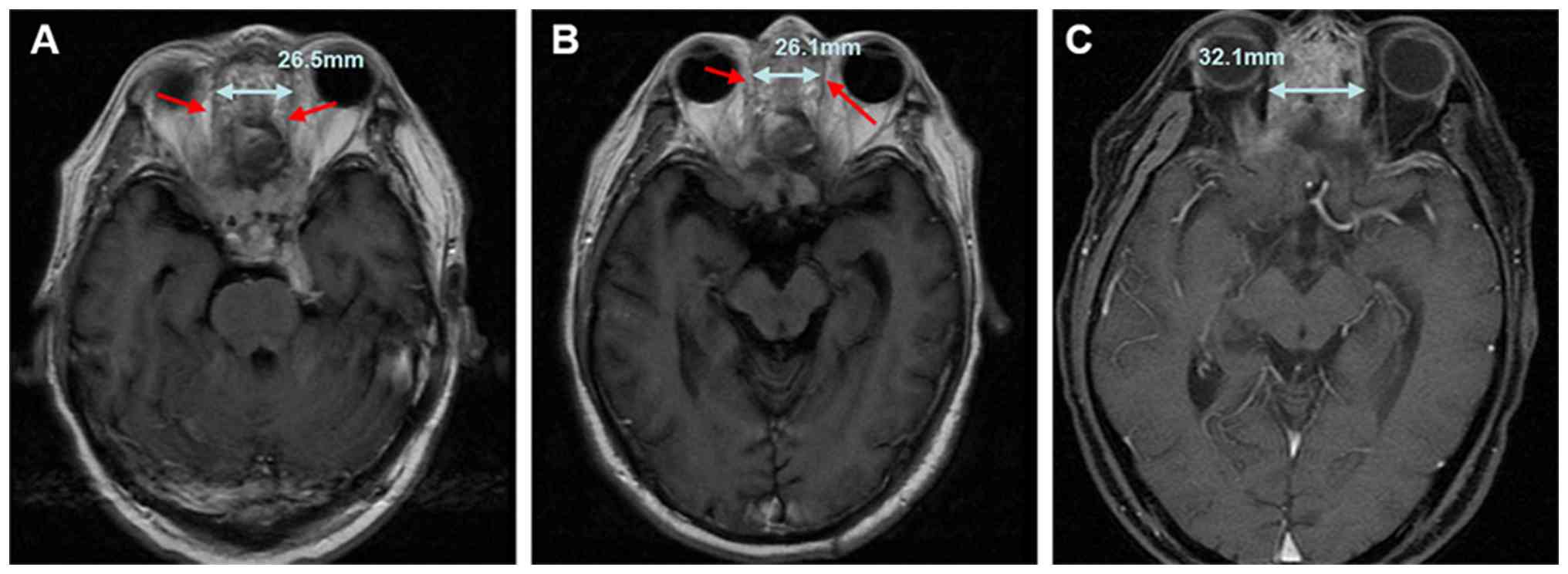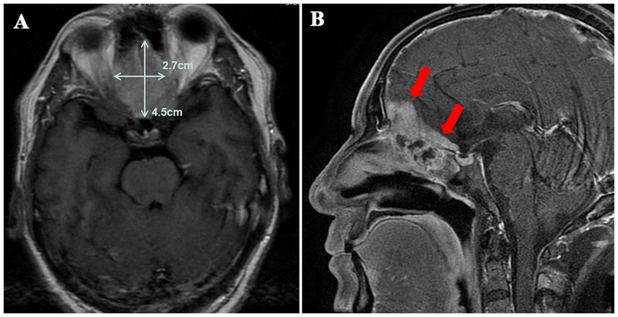 First, inadequate post-operative radiotherapy dosage is likely a key factor contributing to early local recurrence. Non-‘R0’ resection represents a high-risk factor for the early post-operative recurrence of ITAC (24). In the present case, the tumor was located in the ethmoid sinus and had extended to the skull and orbit, adjacent to the optic nerve and other vital structures. The anatomical complexity of this region rendered a complete ‘R0’ resection challenging, which may have contributed to the early post-operative recurrence of the patient. In an observational study, Abu-Shama et al (25) analyzed the surgical data of 13 patients with localized recurrence and found that difficulty was experienced in dissecting the cribriform plate or the lateral lamina during surgery in 11 of these patients.