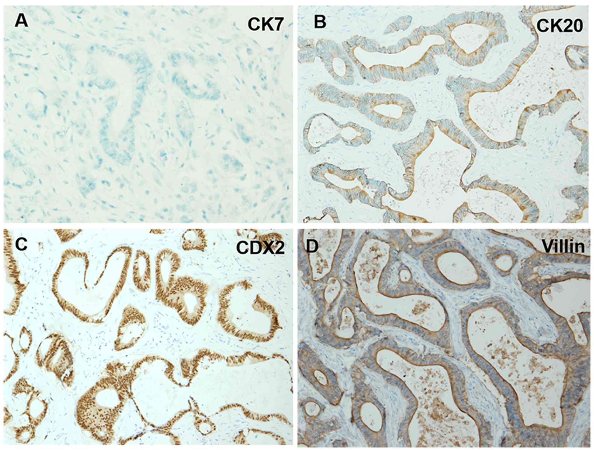 Kennedy MT, Jordan RCK, Berean KW and Perez-Ordoñez B: Expression pattern of CK7, CK20, CDX-2, and villin in intestinal-type sinonasal adenocarcinoma. J Clin Pathol. 57:932–937. 2004. View Article : Google Scholar : PubMed/NCBI | |