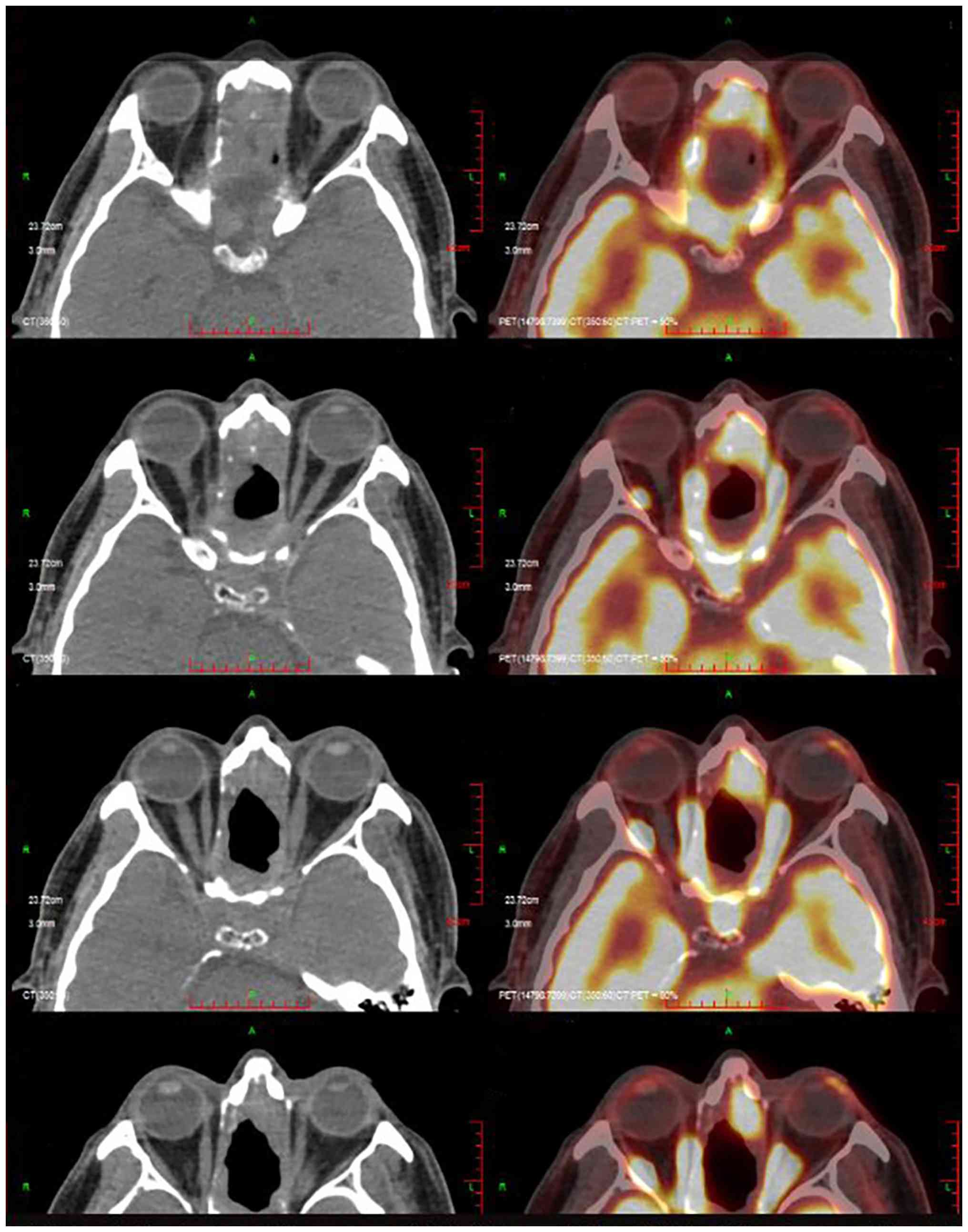 The present case report has several limitations. Firstly, as a single case report, the present study lacks statistical analysis and can only provide limited reference value. Secondly, due to the different positions of the patient during the radiotherapy planning CT and the PET-CT scan for recurrence diagnosis, precise registration comparison between the two could not be performed. Nevertheless, sectional images near the optic nerve (the main recurrence site) are included in Fig. S1. Thirdly, the recurrence diagnosis described in this manuscript was based on pathology reports rather than retrievable original image files, which may represent a limitation of this study. Fourthly, due to the low incidence of this tumor, there were virtually no established clinical guidelines to reference during the management of this patient. The present study merely proposes two preliminary hypotheses, and further data from other cases and studies are required to provide stronger evidence for the treatment of ITAC.