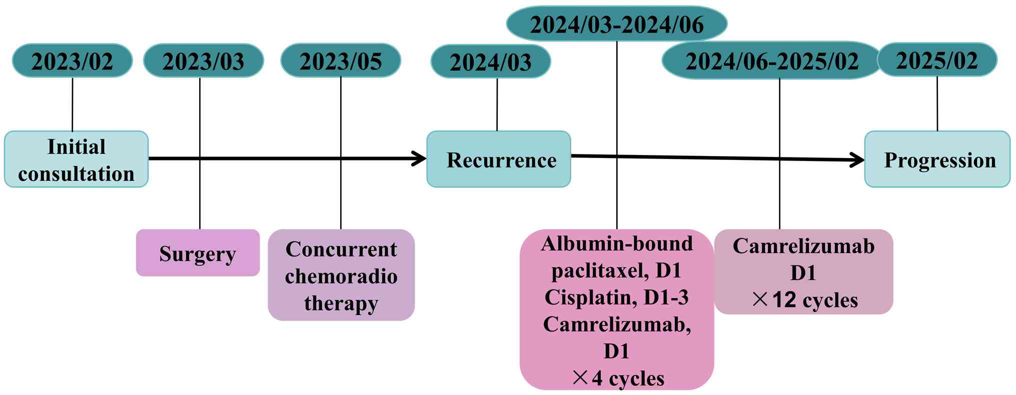 At 12 months post-surgery, the patient experienced bilateral vision loss, visual distortion, headaches, nausea and vomiting. A positron emission tomography-computed tomography (PET-CT) scan indicated tumor recurrence in the ethmoid and sphenoid sinuses, the anterior portion of the left nasal cavity and the nasal septum (Fig. 4). The biopsy results confirmed the presence of ITAC. Immunohistochemistry revealed PD-L1 expression with a combined positive score (CPS) of 5 and programmed cell death protein 1 (PD-1) positivity at 5% (22). The diagnosis of tumor recurrence, including PET-CT imaging and pathological biopsy, was confirmed at West China Hospital of Sichuan University. Systemic therapy was initiated with a regimen consisting of albumin-bound paclitaxel (300 mg on day 1), cisplatin (30 mg on days 1–3) and camrelizumab (200 mg on day 1) administered intravenously every 3 weeks for four cycles (3 weeks per cycle). Following four cycles of systemic therapy, grade II myelosuppression occurred (white blood cell count, 2.49×109/l; normal reference range, 3.5–9.5×109/l. The physical strength of the patient also markedly declined. The treatment regimen was adjusted to maintenance therapy with single-agent camrelizumab. The monotherapy schedule consisted of 200 mg camrelizumab administered once every 3 weeks. A total of 12 cycles were completed. The detailed course of treatment, including the initiation, adjustment and the duration of each therapeutic intervention, is summarized in a flowchart in Fig. 5. The Systemic therapy and the follow-up was based at the West China hospital and Dazhu People's Hospital.