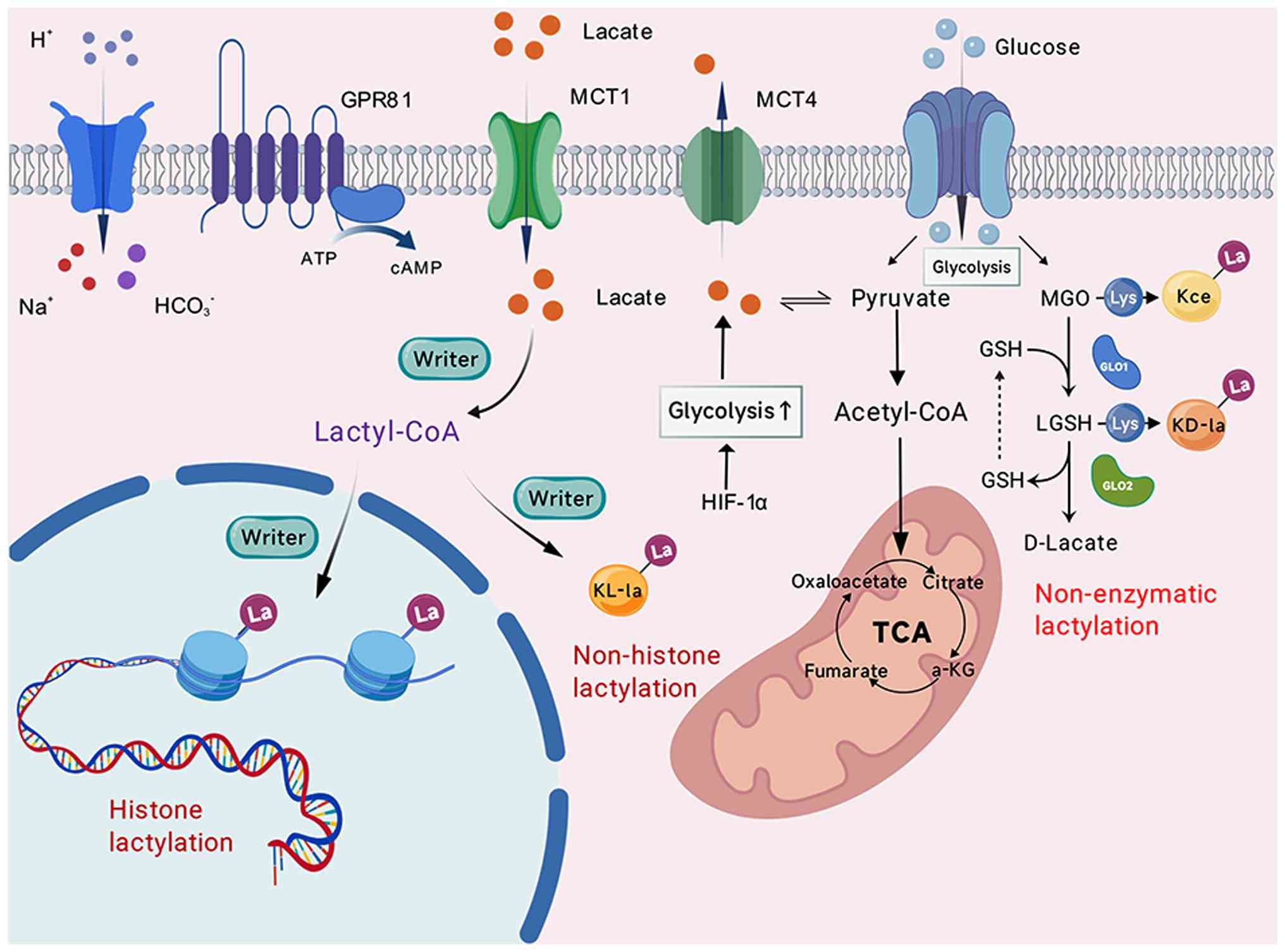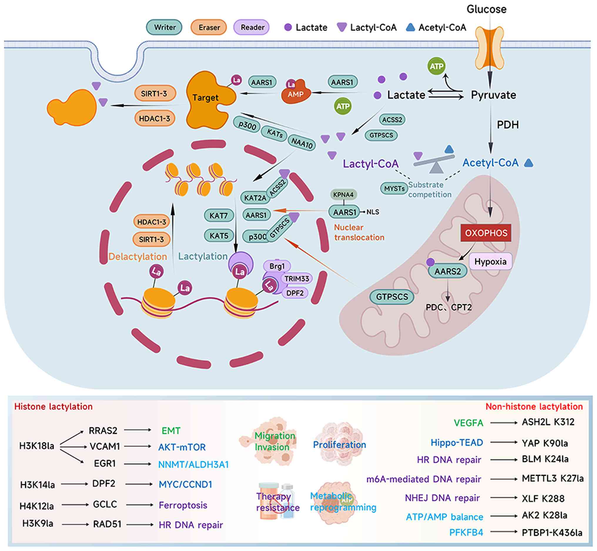 In summary, both Hla and n-Hla form a lactate-derived network that reshapes gene expression and signaling to drive tumor progression. Governed by specific writers, erasers and readers, these regulatory nodes are fundamental for understanding the lactylation landscape. Consequently, elucidating their functions is crucial for translating this metabolic modification into precise therapeutic targets and clinical applications.