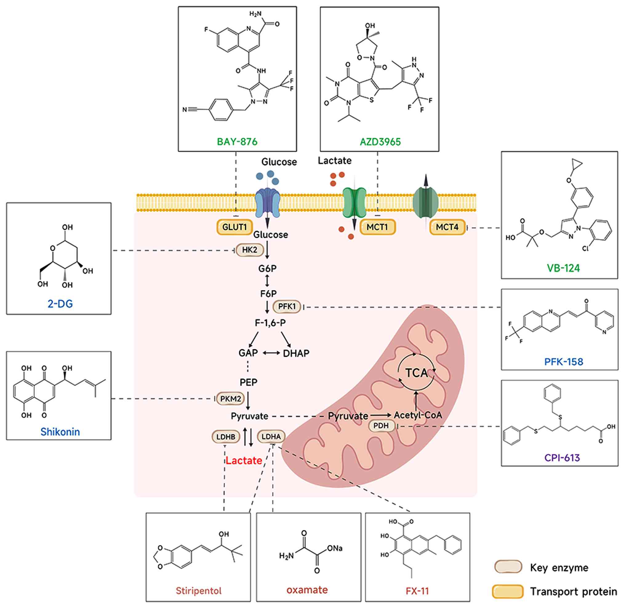 As lactate can be converted to lactyl-CoA, the direct substrate for lactylation, the most effective intervention strategy is to inhibit its production and transport at the source with the aim of reducing lactate accumulation in the TME, thereby diminishing the substrate supply for downstream Kla.