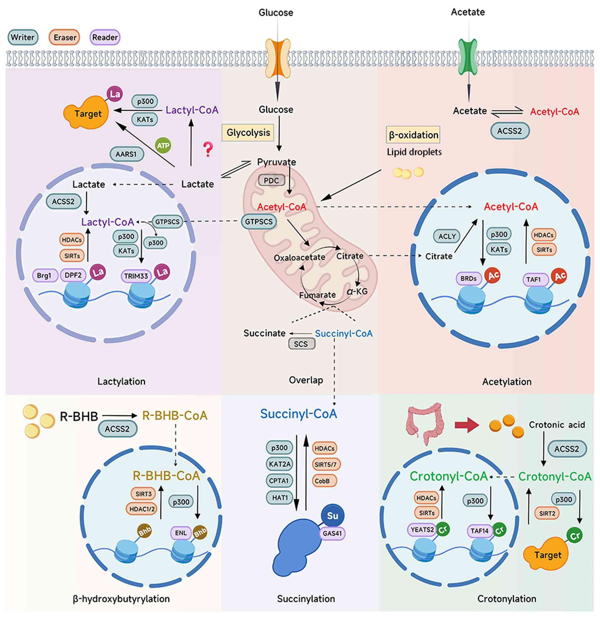 Kla and Kac share the same writers and erasers, which creates a complex regulatory landscape involving multiple PTMs. This is also reflected in other emerging modifications (188–190). For instance, lactylation shares regulatory systems with other modifications such as succinylation and crotonylation, including enzymes such as p300/CBP, KAT2A, HDACs and SIRTs (188,189). Furthermore, these PTMs often need to share coenzyme synthetases (such as ACSS2) to provide the substrate acyl-CoAs, leading to substrate competition. The modification type catalyzed by p300/CBP is directly dependent on the relative concentration of available acyl-CoA substrates at its active site. Under a high lactate environment, the p300 active site is more likely to encounter lactyl-CoA, causing its catalytic activity to switch from writing Kac to writing Kla. Secondly, lactyl-CoA synthetases produce large quantities of lactyl-CoA, creating a local environment where lactyl-CoA is dominant, and synergize with lactyl-CoA transferases to promote lactylation, such as the synergistic effect of ACSS2 and KAT2A (96). Similarly, GTPSCS translocates into the nucleus and forms a complex with p300, generating a high local concentration of lactyl-CoA, which in turn enhances H3K18la (47). Fig. 4 illustrates this integrated regulatory network, highlighting how shared enzymatic machinery and substrate competition facilitate the crosstalk between diverse PTMs.