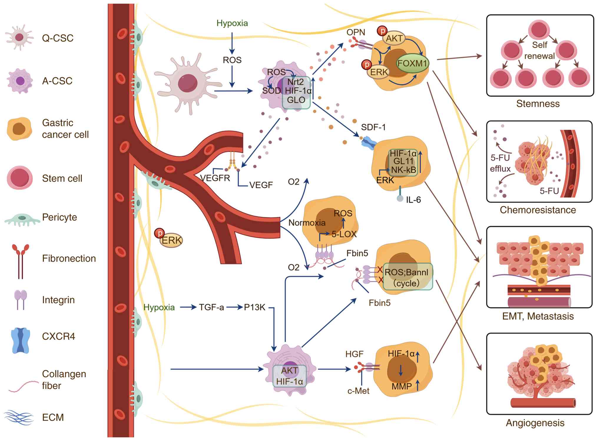 Cancer stem cells (CSCs) represent a small subpopulation within tumors that generate heterogeneous tumor cells while possessing self-renewal capacity and are regarded as critical factors driving tumor progression (157–159). One study demonstrated that HIF-1α can drive the progression of GC by promoting the stemness of GC cells (111). Other research has confirmed that HIF-1α further facilitates peritoneal dissemination of GC by enhancing the stemness of its cells (160). Currently, research on the role of HIF in gastric CSCs remains limited, and no drugs targeting CSCs have achieved successful clinical application; thus, this role warrants further investigation.