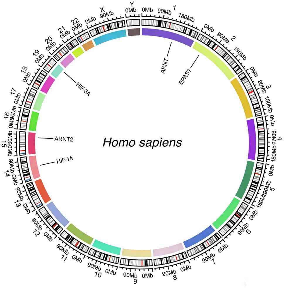 HIF-2 is a member of the basic bHLH-PAS transcription factor family that mediates cellular adaptive responses to hypoxia, with distinct functional specificity compared with HIF-1 (99,170,171). Functionally, HIF-2 acts as a heterodimer, typically composed of the oxygen-sensitive HIF-2α subunit [encoded by the endothelial PAS domain-containing protein 1 (EPAS1) gene] and a constitutively expressed β subunit, which can be either an ARNT (HIF-1β) or ARNT2 (HIF-2β) depending on tissue context (170,172,173). The EPAS1 gene, which encodes HIF-2α, is localized to the human chromosome 2p21 region, while the ARNT2 gene, which encodes HIF-2β, is localized to the human chromosome 15q23-q25 region (Fig. 3). Structurally, both HIF-2α and its β partners contain a conserved bHLH domain at the N-terminus, which is essential for sequence-specific binding to the HRE (core sequence 5′-TACGTG-3′) in target gene promoters (174–177).