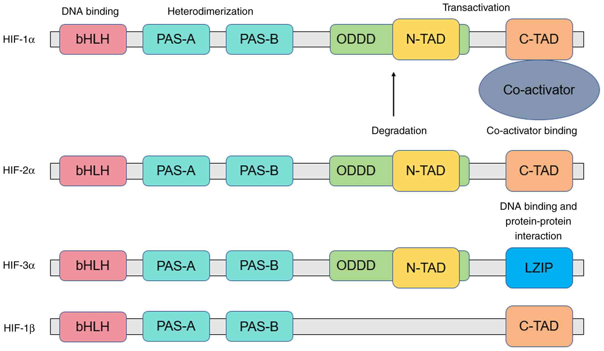 Both HIF-1α and HIF-1β possess a bHLH domain, which is critical for their binding to the HRE within the promoter region of target genes. The N-terminal region of HIF-1α additionally contains PAS domains, which enable its heterodimerization with HIF-1β (Fig. 4) (102,103). Two transactivation domains (TADs) are located in the C-terminal segment of HIF-1α: An N-terminal TAD (N-TAD) and a C-terminal TAD (C-TAD), and these TADs are responsible for modulating the interaction between HIFs and co-activators (104). Notably, HIF-1α harbors an oxygen-dependent degradation domain (ODDD) that overlaps with the N-TAD-a structural characteristic that differentiates HIF-1α from HIF-1β (Fig. 4). The ODDD functions as a recognition motif for the VHL tumor suppressor protein and is involved in regulating the stability of HIF-1α in an oxygen-dependent manner (104). When two proline residues within the ODDD are hydroxylated by oxygen-sensitive (PHD) domain-containing proteins, HIF-1α undergoes rapid proteasomal degradation (105). In contrast to HIF-1α, which has a short half-life, HIF-1β maintains a stable protein expression level because it lacks the ODDD and N-TAD (Fig. 4).