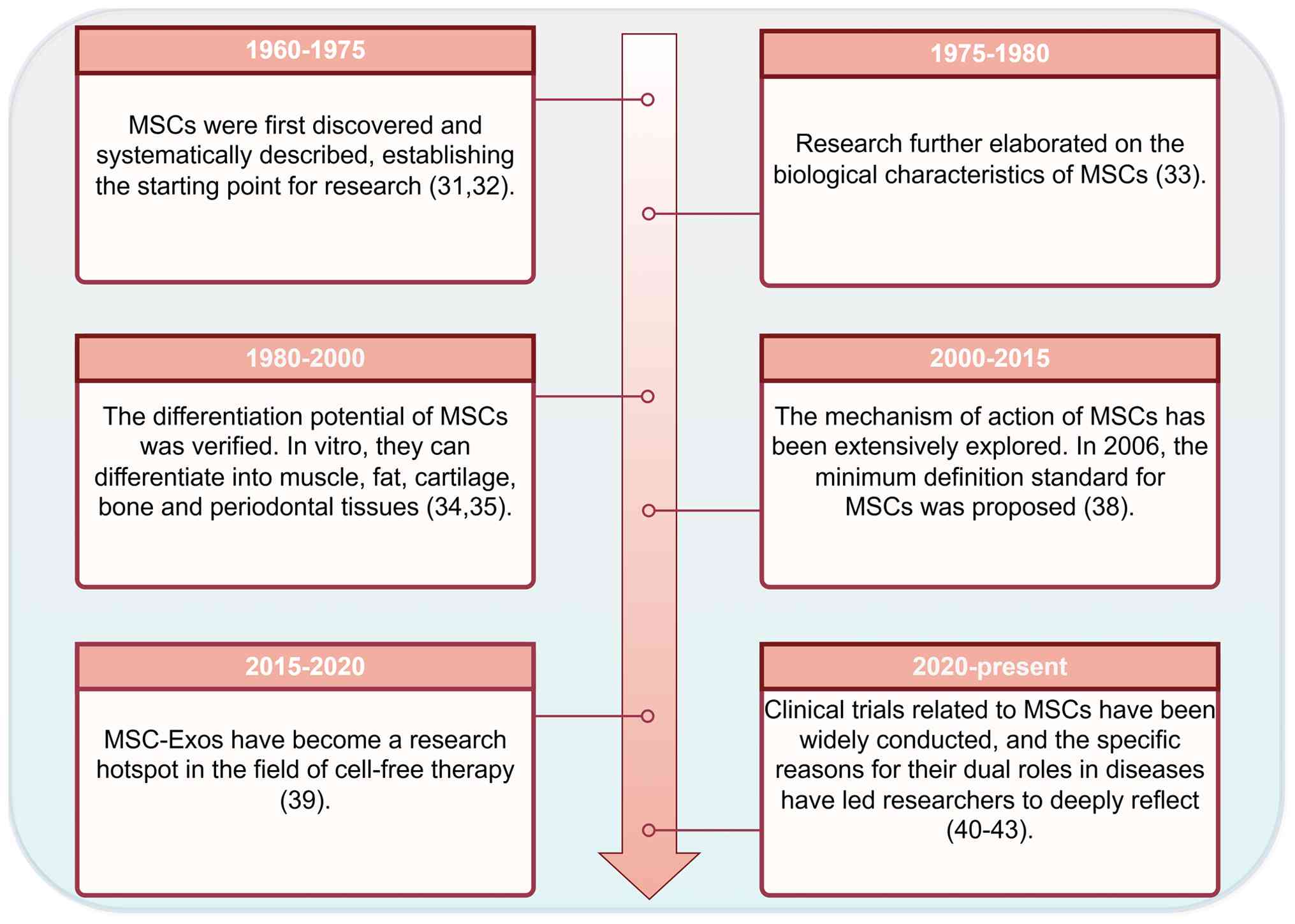 The origin of MSCs can be traced back to the mid-to-late 20th century (30). After decades of exploration, researchers have now developed a relatively systematic understanding of these cells (Fig. 1). As early as 1960-1975, researchers first identified a type of non-hematopoietic stem cell in the bone marrow with clonogenic capacity and adherence-dependent growth (31). Friedenstein et al (32) were the first to systematically isolate and characterize these cells, which is considered the starting point of research on MSCs. This discovery demonstrated for the first time that within the complex hematopoietic microenvironment of the bone marrow, there exists a unique group of non-hematopoietic precursor cells, laying the theoretical foundation for subsequent studies on MSCs.