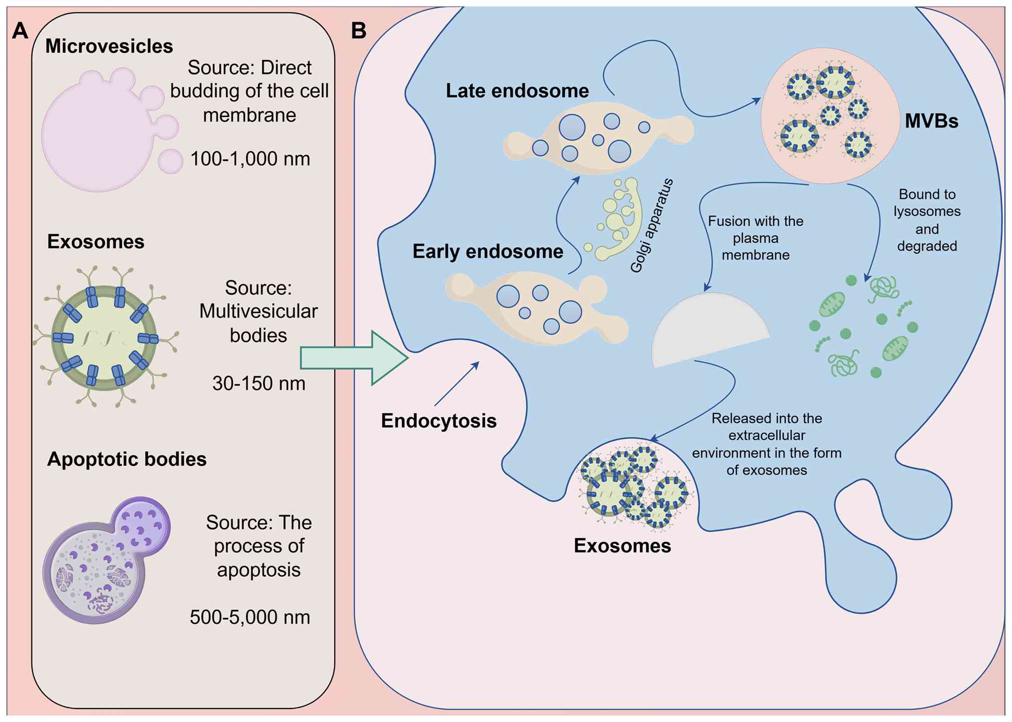 EVs are heterogeneous collections of particles enclosed by a lipid bilayer membrane. EVs are typically classified into three main types based on their biogenesis pathways and size (57). Among them, exosomes are small nanovesicles (diameter, 30–150 nm) derived from the endosomal system (58), which distinguishes them from the larger microvesicles (diameter, 100–1,000 nm) and the distinctively originating apoptotic bodies (diameter, 500–5,000 nm) (59,60) (Fig. 2A). The biogenesis of exosomes is a complex process (Fig. 2B). It begins with endocytosis at the cell membrane surface, forming early endosomes. Early endosomes further mature, receive transport vesicles from organelles such as the Golgi apparatus and undergo processes such as acidification to transform into late endosomes. Within late endosomes, the membrane invaginates inwardly a second time, forming multiple intraluminal vesicles (ILVs) through budding (61–63). Late endosomes containing numerous ILVs are termed multivesicular bodies (MVBs). MVBs undergo either of two pathways: Most MVBs fuse with lysosomes, leading to the degradation of the ILVs, while a small portion of MVBs fuse with the plasma membrane, releasing the ILVs into the extracellular environment. These released ILVs are termed exosomes (61,64,65). Similar to MSCs, the sources of exosomes are diverse (Fig. 3). Besides being present in MSCs and various immune cells (66–68), exosomes are also widely found in tumor cells (69,70). Furthermore, exosomes exist in various bodily fluids, including blood, urine, breast milk and semen (71,72). Exosomes have also been detected in certain foods and plants (73–77).