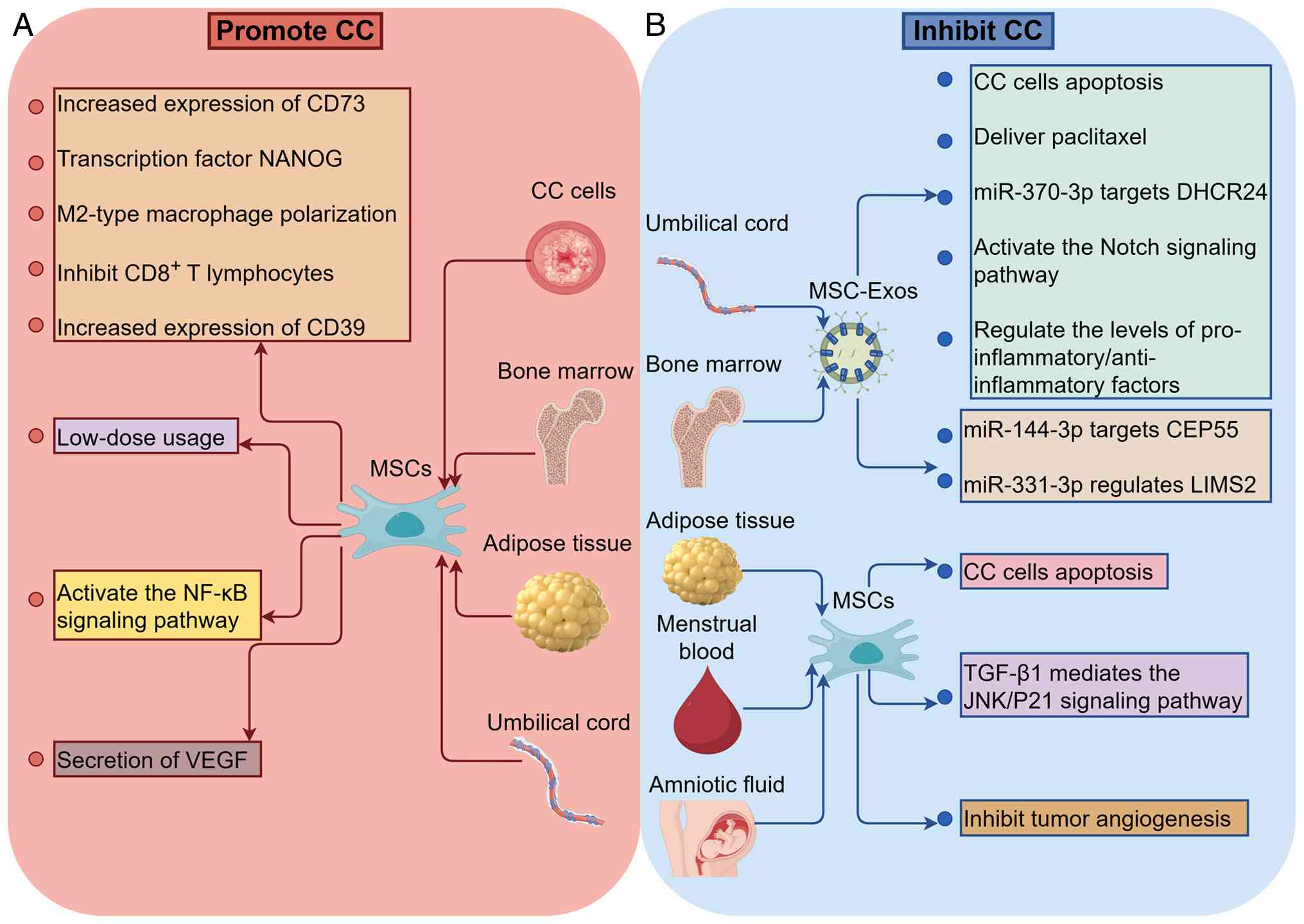 In summary, MSCs and their exosomes exhibit a distinct dual role in CC (Fig. 4): MSCs and their exosomes can both promote tumor cell proliferation, angiogenesis and immune escape, as well as inhibit tumor cell proliferation, induce apoptosis and modulate the immune microenvironment. This bidirectional effect is likely closely associated with their tissue origin, dosage, administration route and the specific signaling molecules carried by the exosomes. These aspects will be discussed in detail in the following sections.