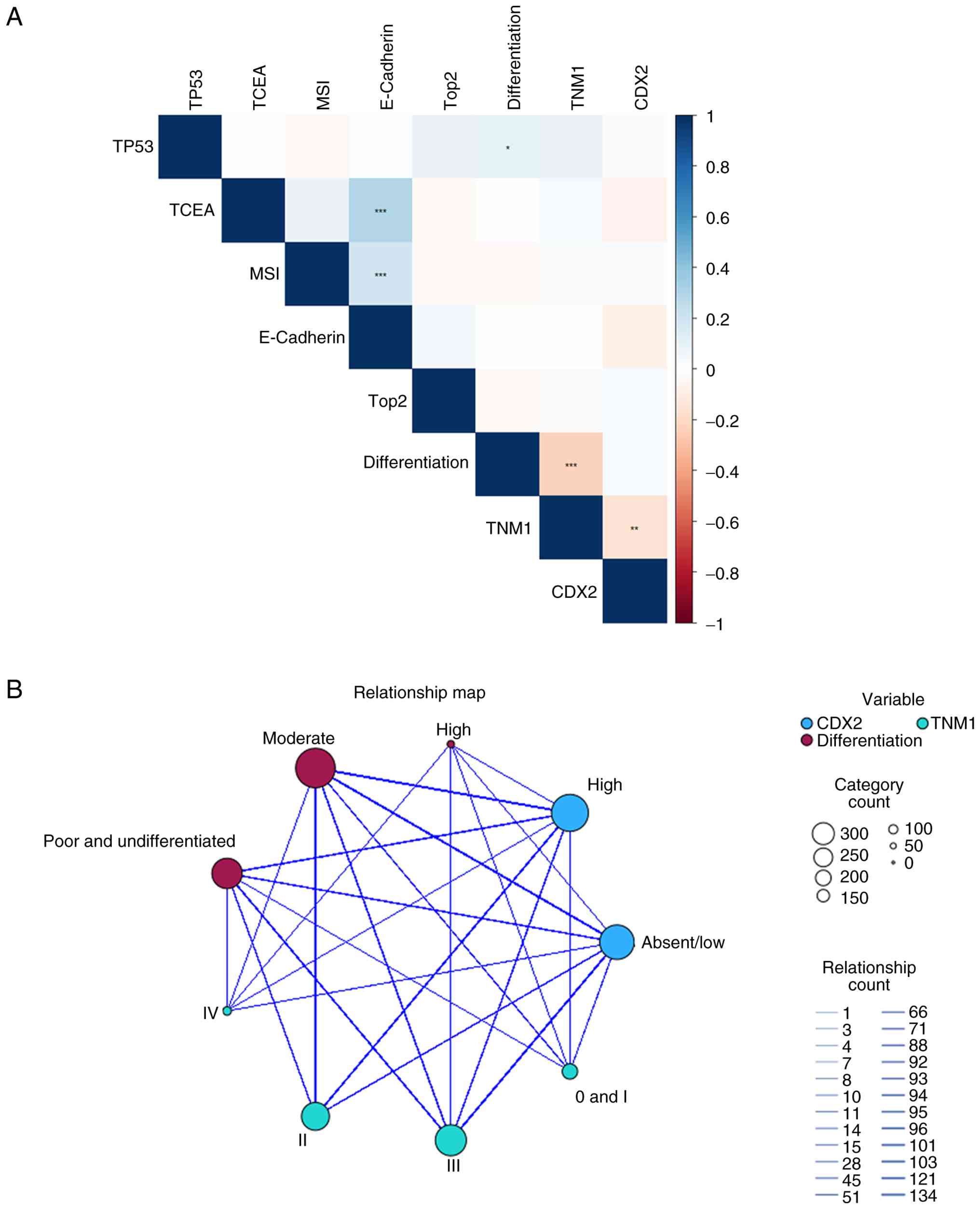Pairwise associations between all categorical variables listed in Table II were analysed using Spearman's rank correlation. Significant correlations were found between tp53 and differentiation (P=0.016) and between tp53 and TNM1 stage (P=0.024). Significant correlations were also observed between TCEA and E-cadherin (P<0.001), between E-cadherin and MSI (P<0.001), between tumour differentiation and TNM1 stage (P<0.001) and between TNM1 stage and CDX2 expression (P=0.001). Correlation coefficients and P-values are provided in Table II and visualised in a correlation matrix (Fig. 2A). To further clarify these relationships, crosstabulation analyses confirmed strong associations between CDX2 expression (absent/low vs. high) and moderate differentiation, TNM1 stages II and III and poor/undifferentiated differentiation. A strong association was also observed between moderate differentiation and TNM1 stages II and III (Fig. 2B).